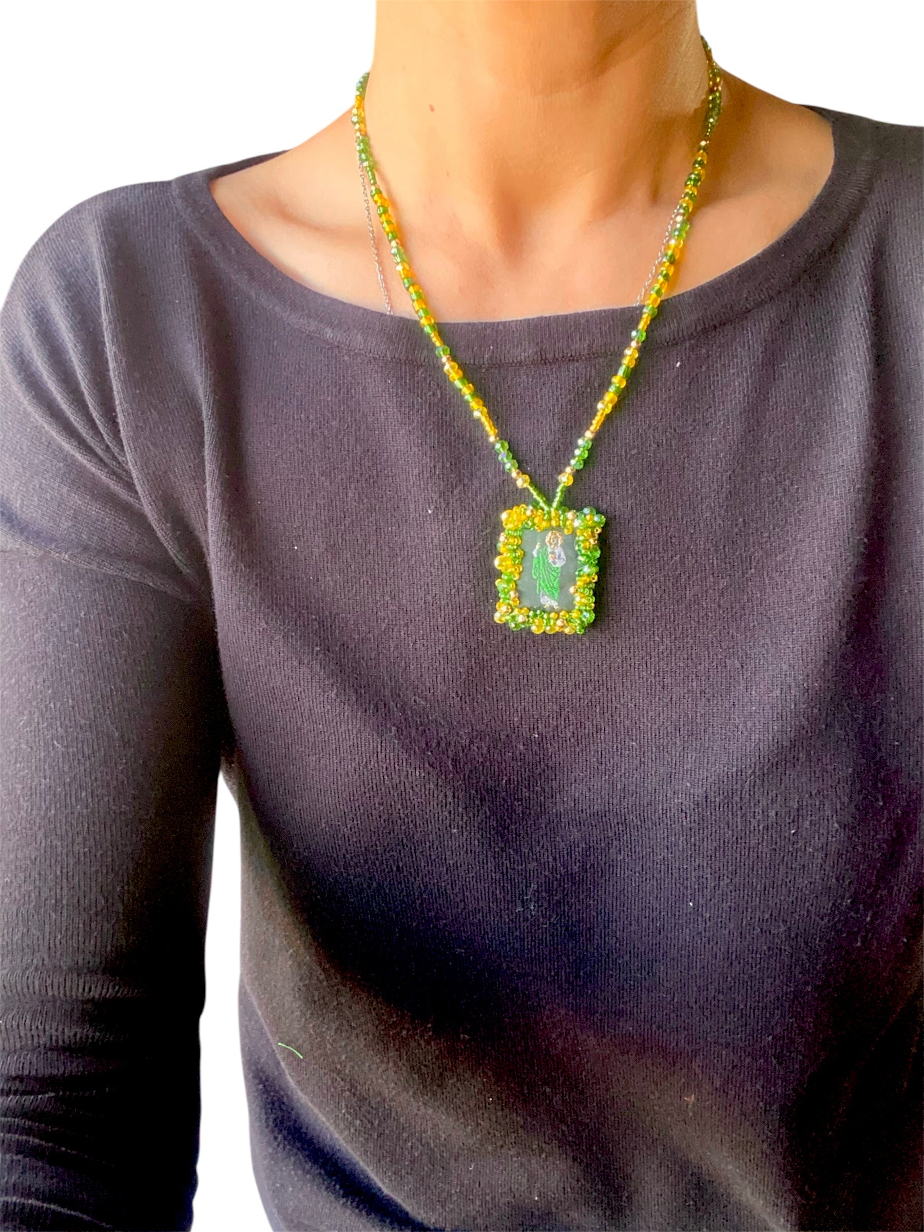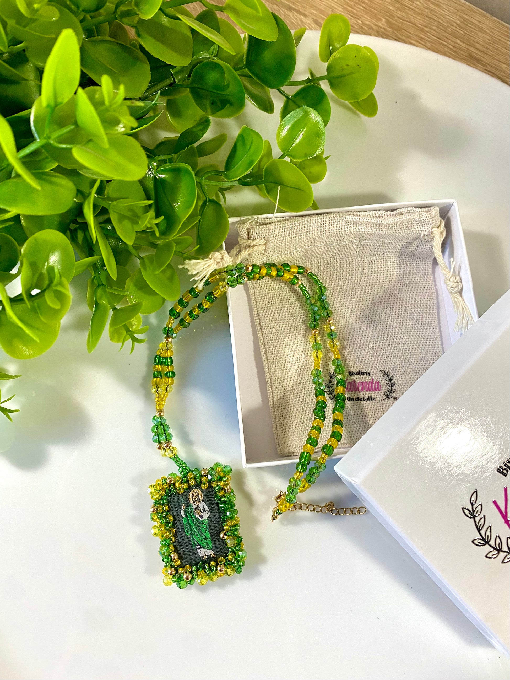 Collar de Escapulario bordado y elaborado con Chaquira, Cristal y detalles dorados de Chapa, personalizado con Fotografía y del otro lado la imagen de San Judas Tadeo.