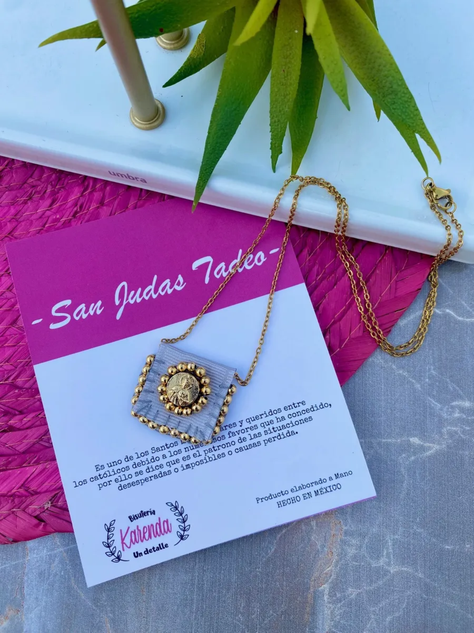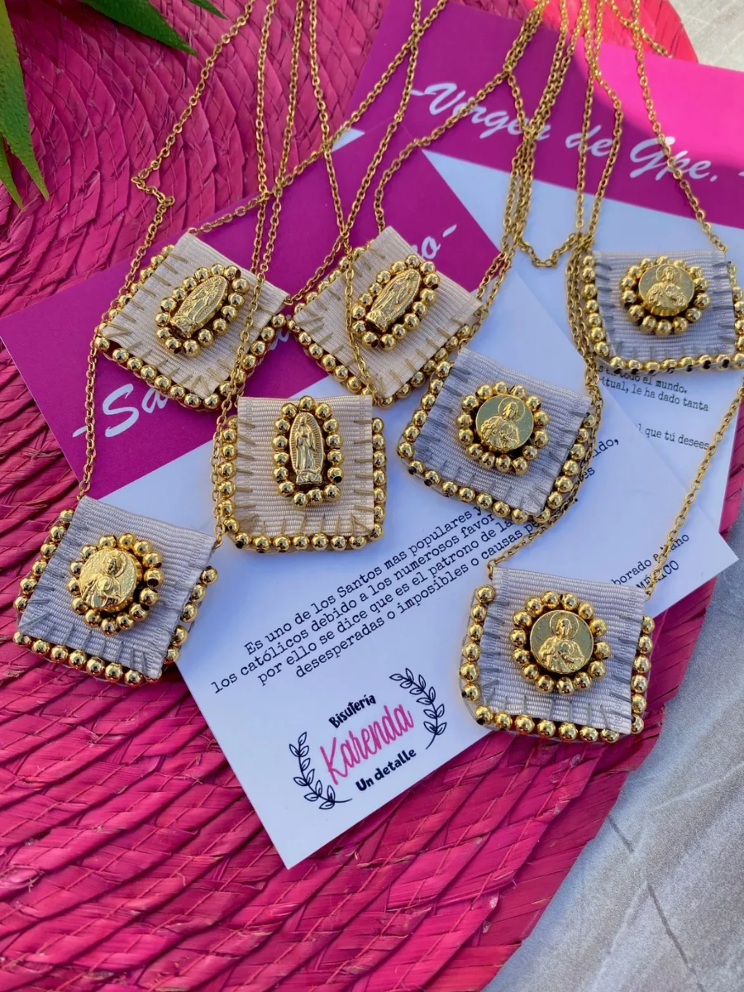 Collar elaborado con Téxtil Bordado con cuentas Doradas de Chapa y Dije Religioso, con cadena de eslabones sencillos.
