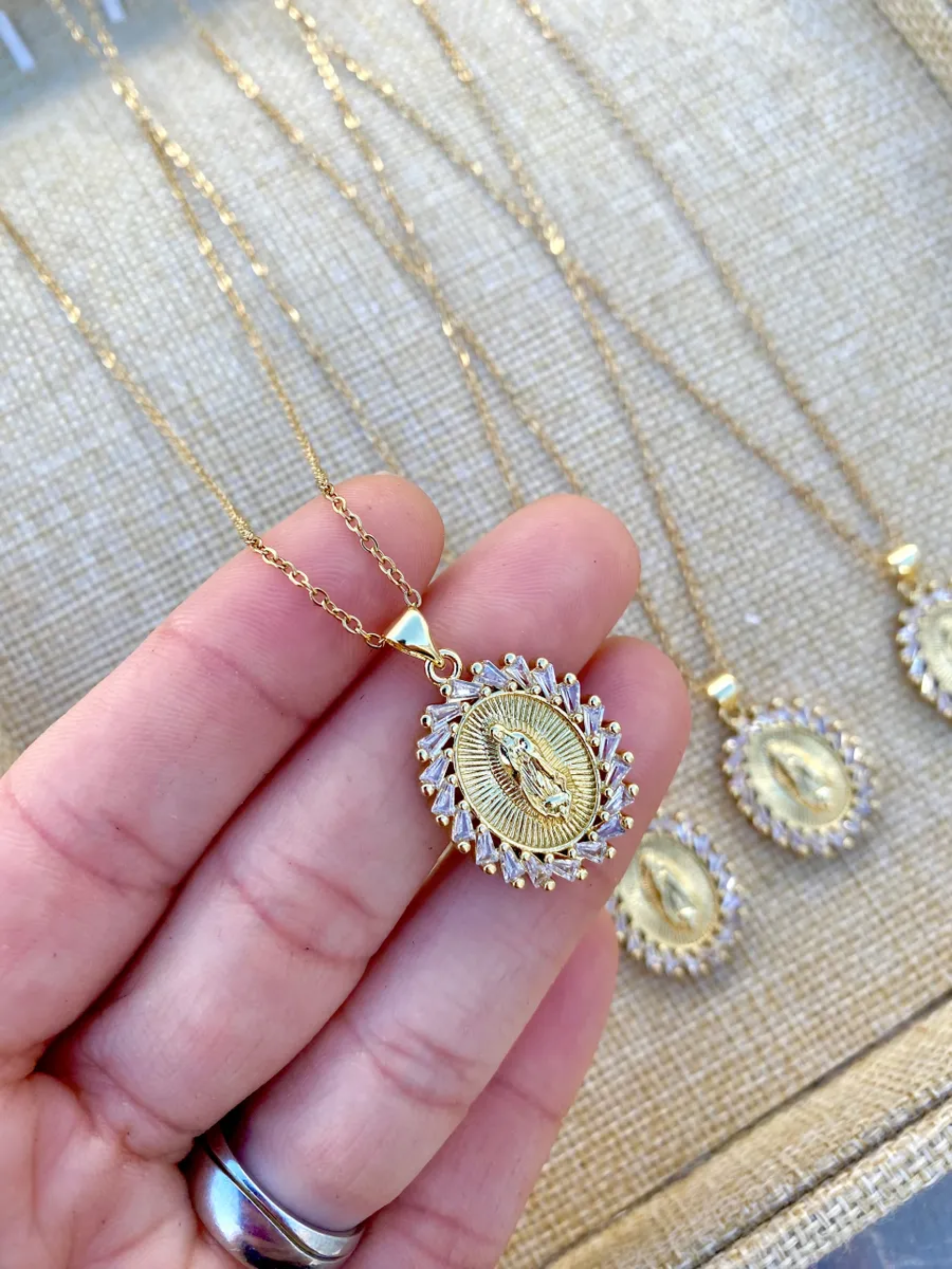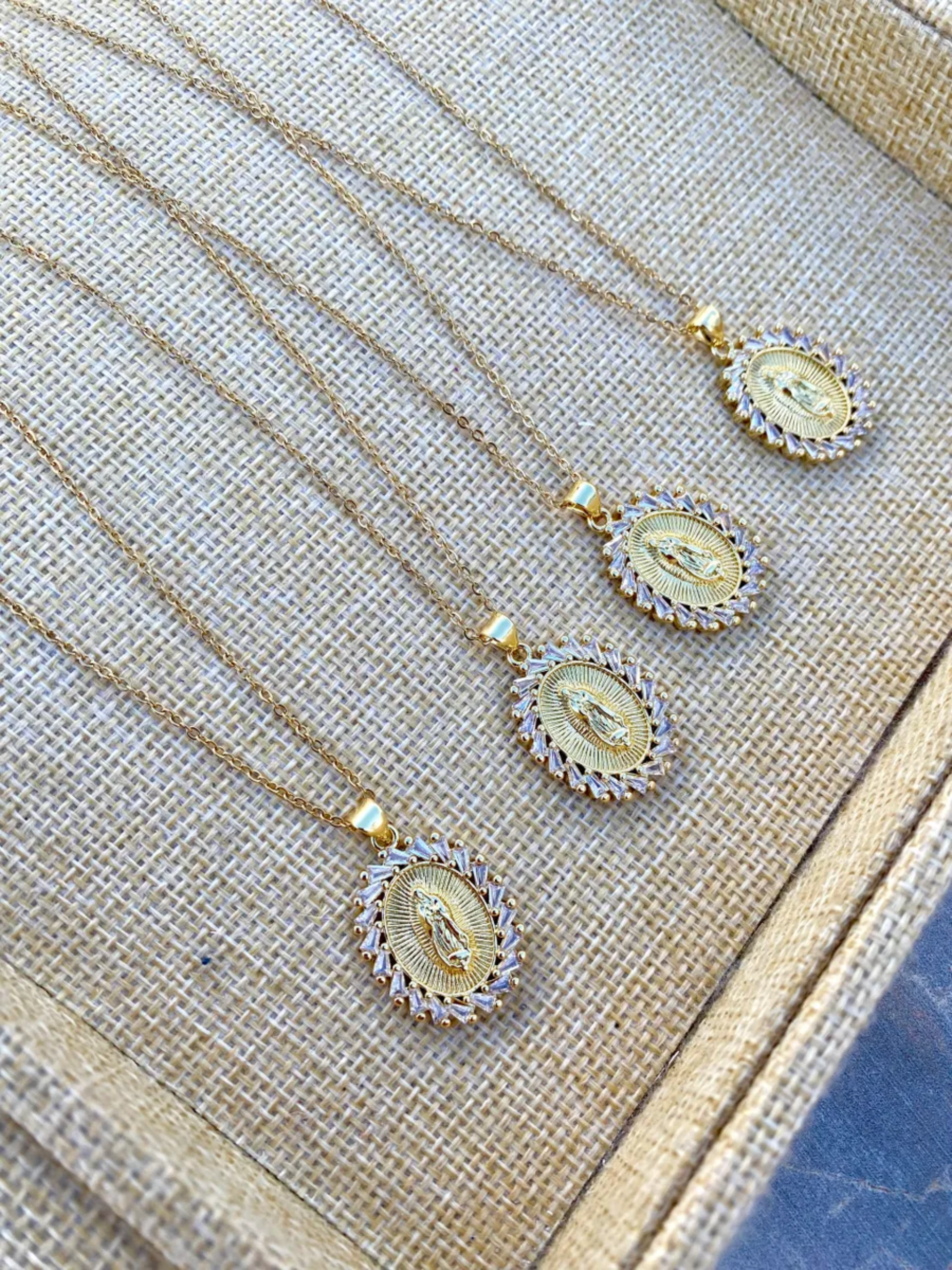 Collar de cadena sencilla con dije de Virgen de Guadalupe con Cristales.
