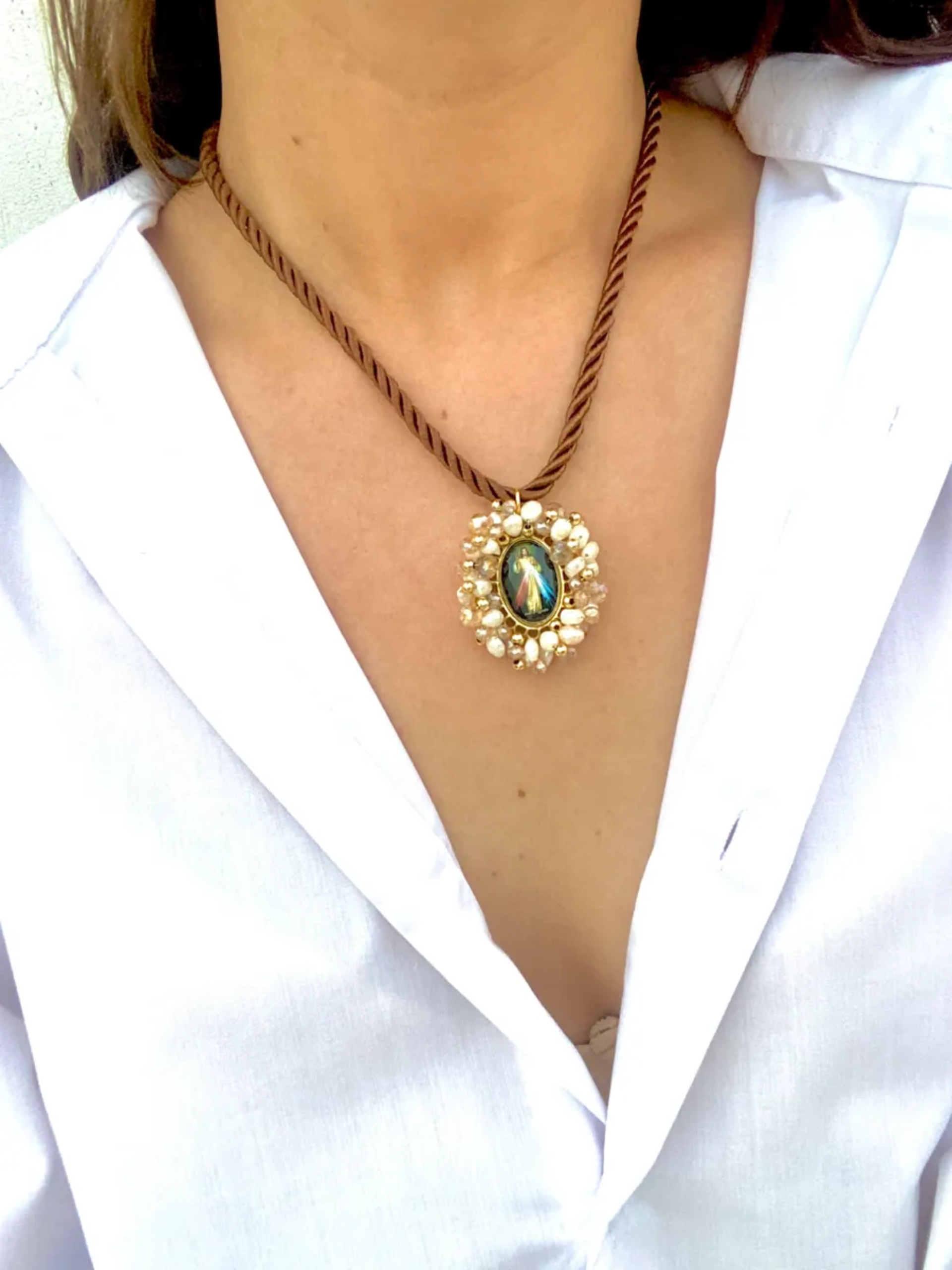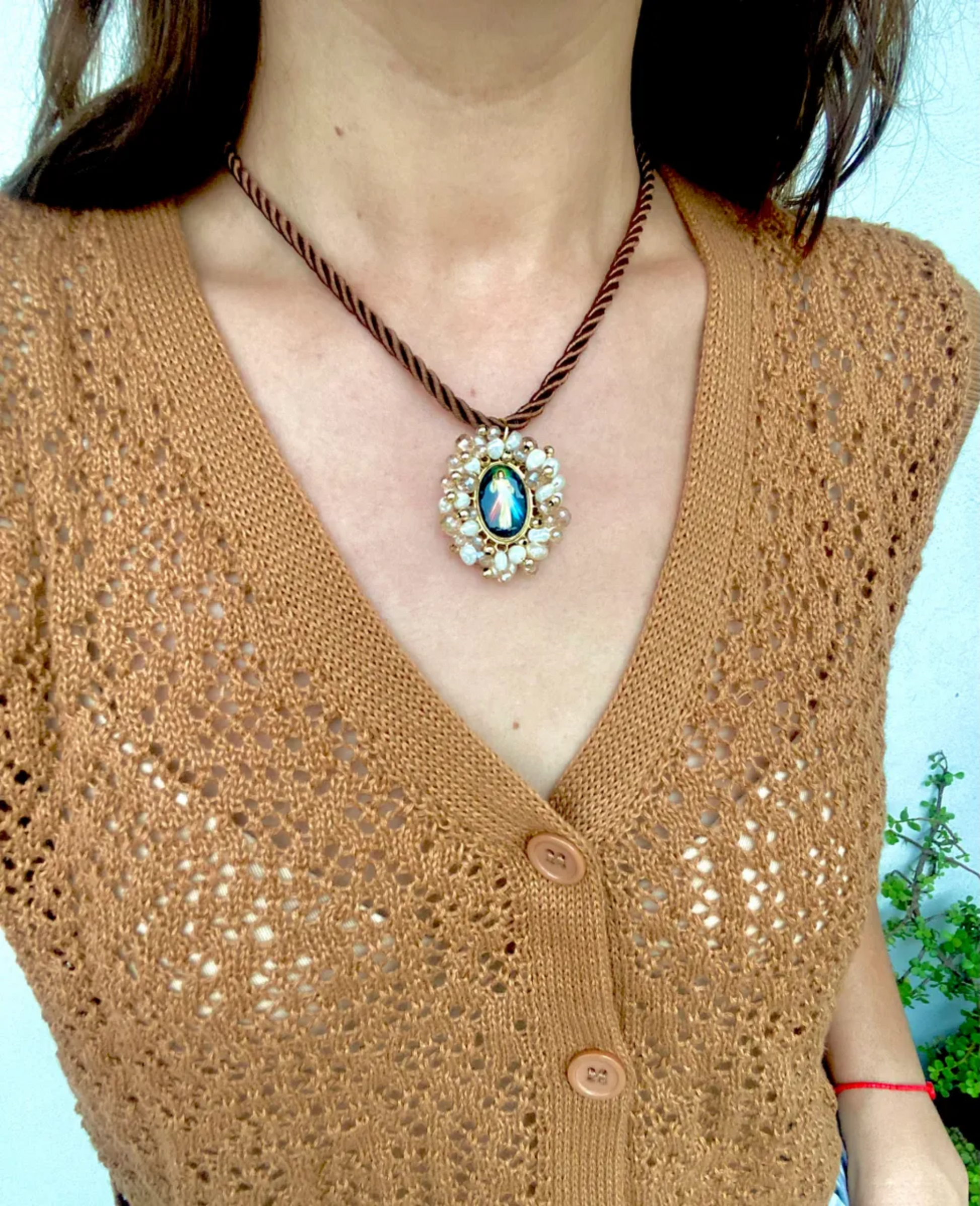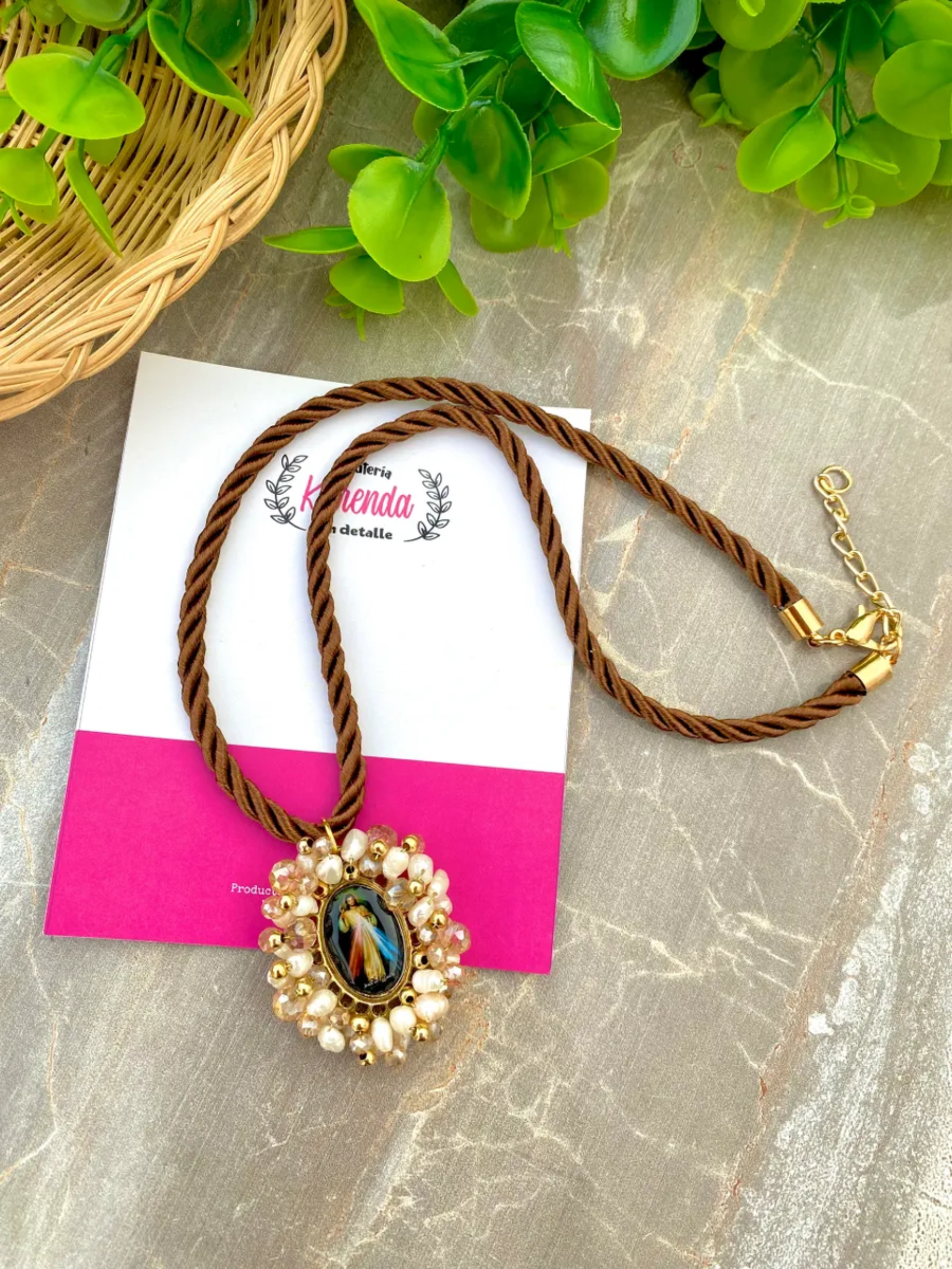 Collar con Aretes Juego, de Cordón con Dije de Virgen de Guadalupe, con detalles de Cristal, Chapa y Perla del Rio.