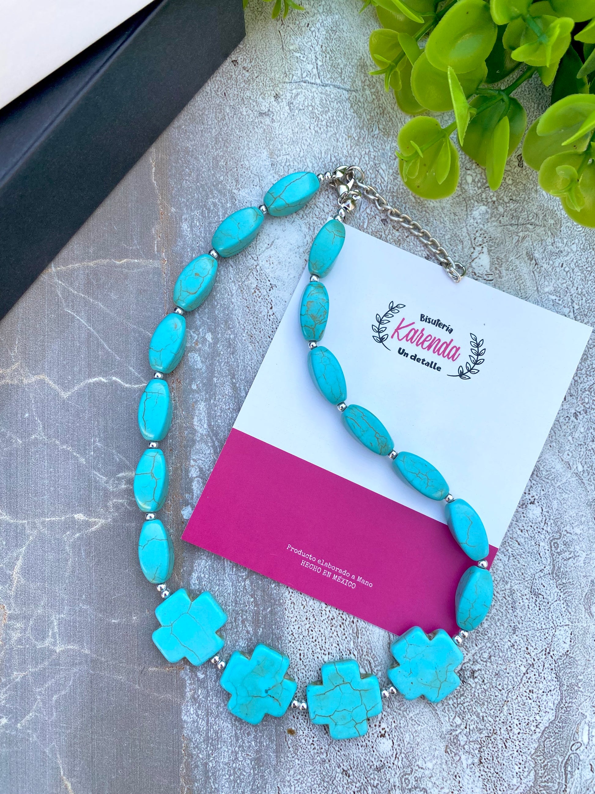 Collar corto con detalles de piedra natural turquesa, detalles en forma de cruz.