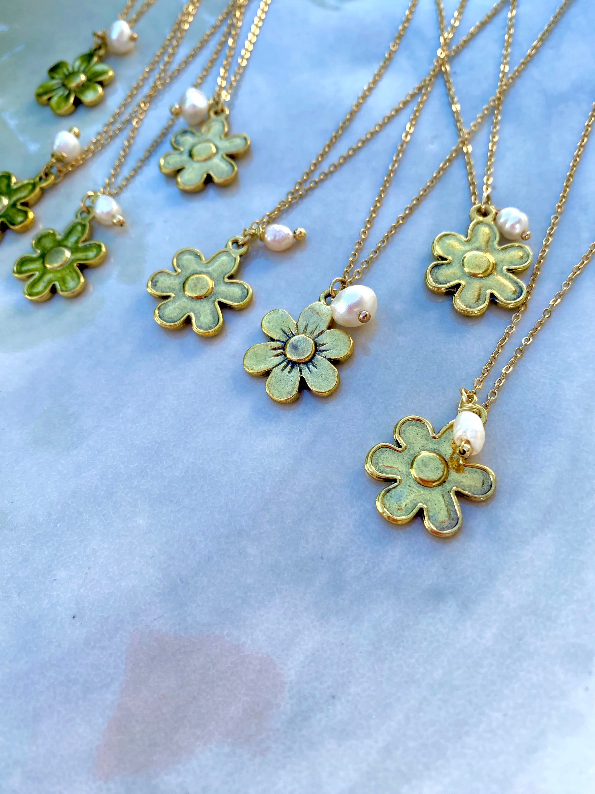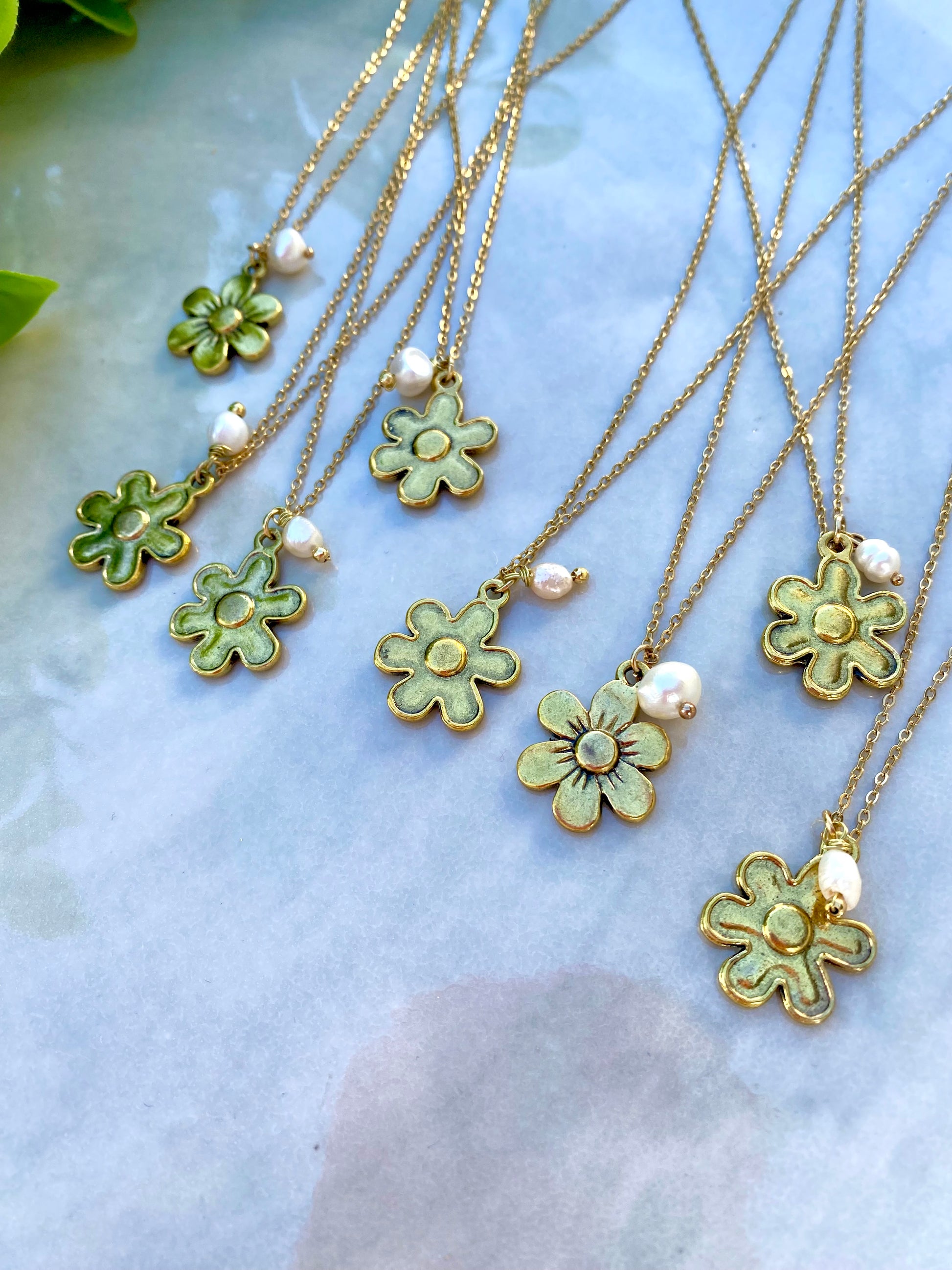 Collar de cadena sencilla con dije de Flor, con detalle colgante de Perla.