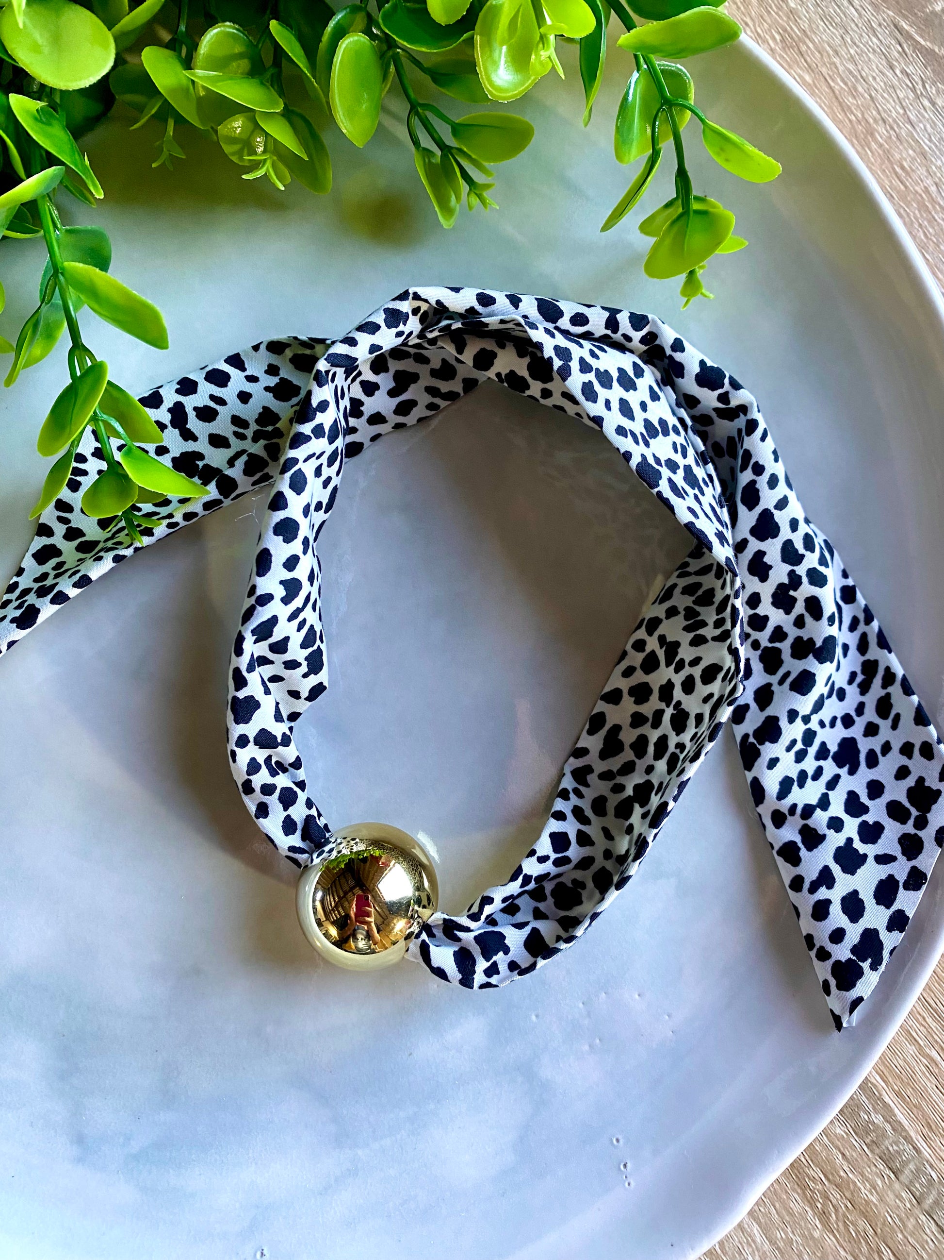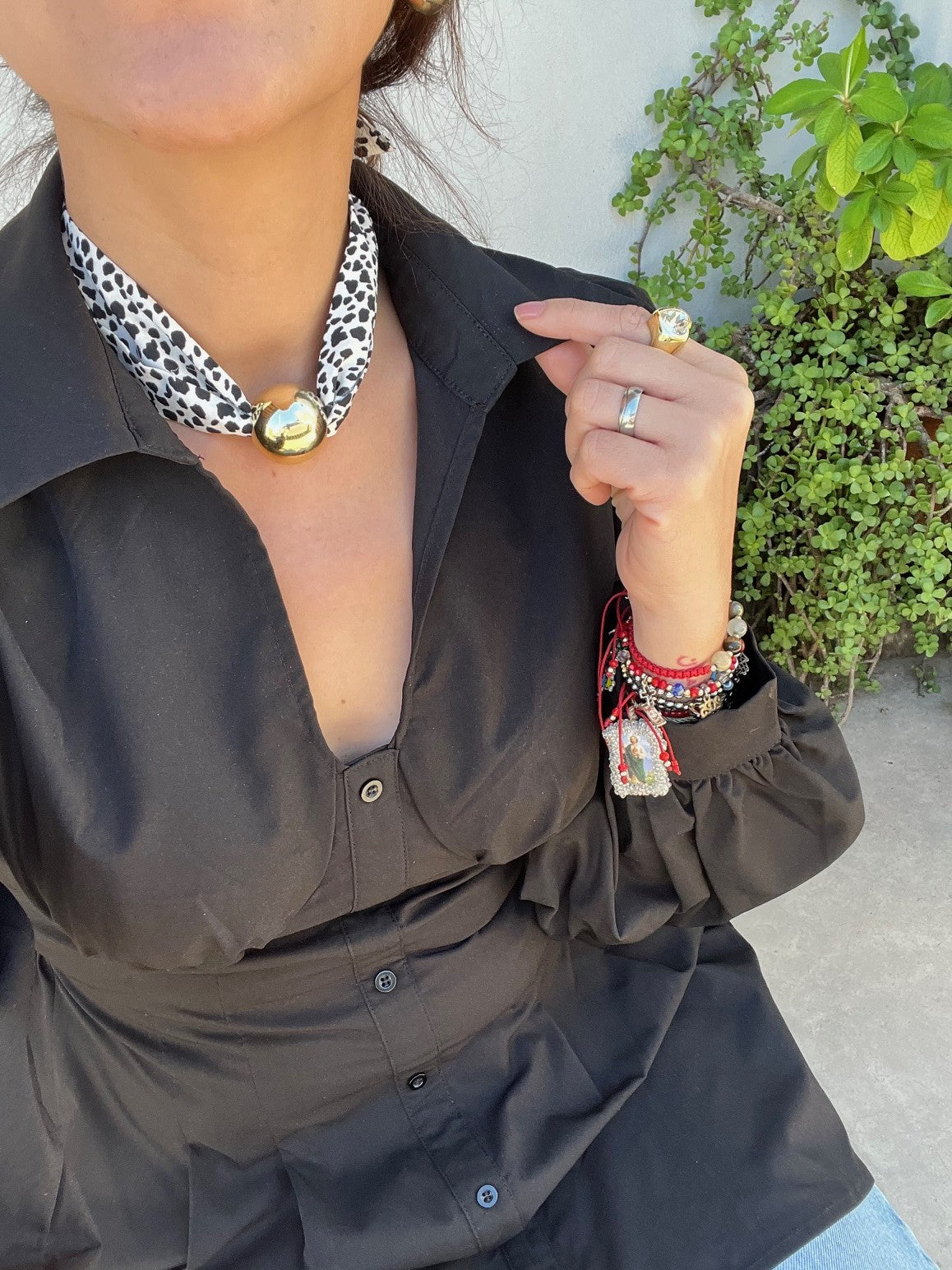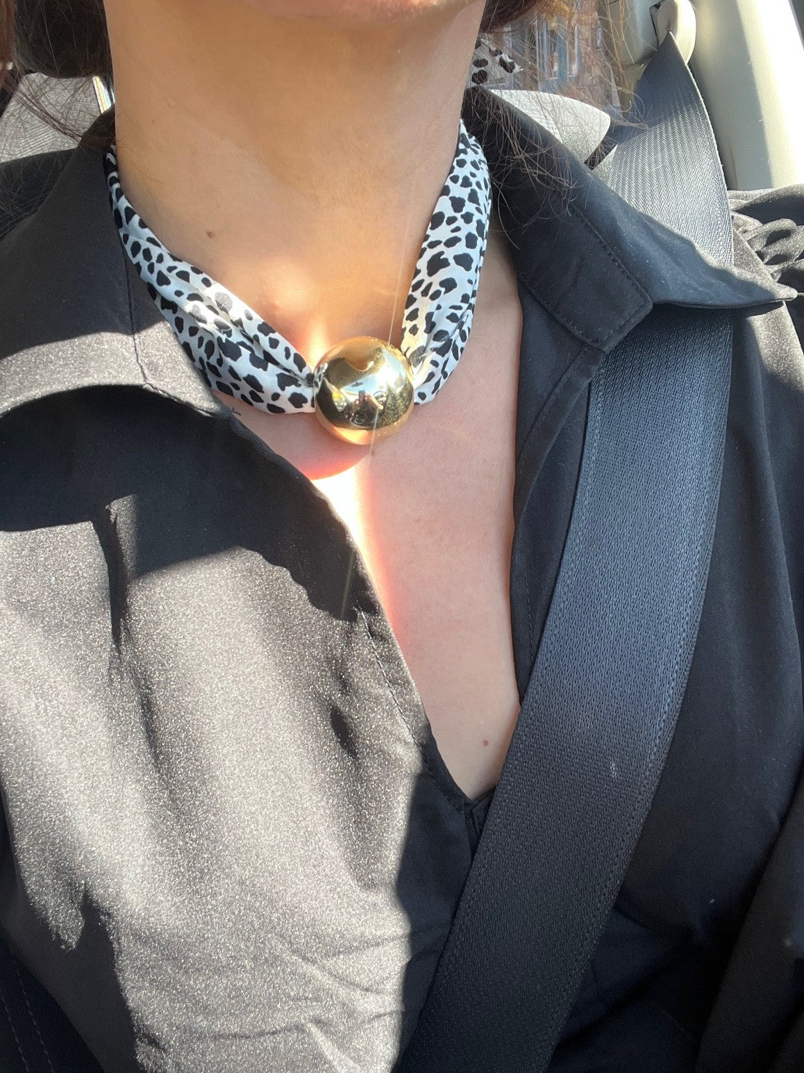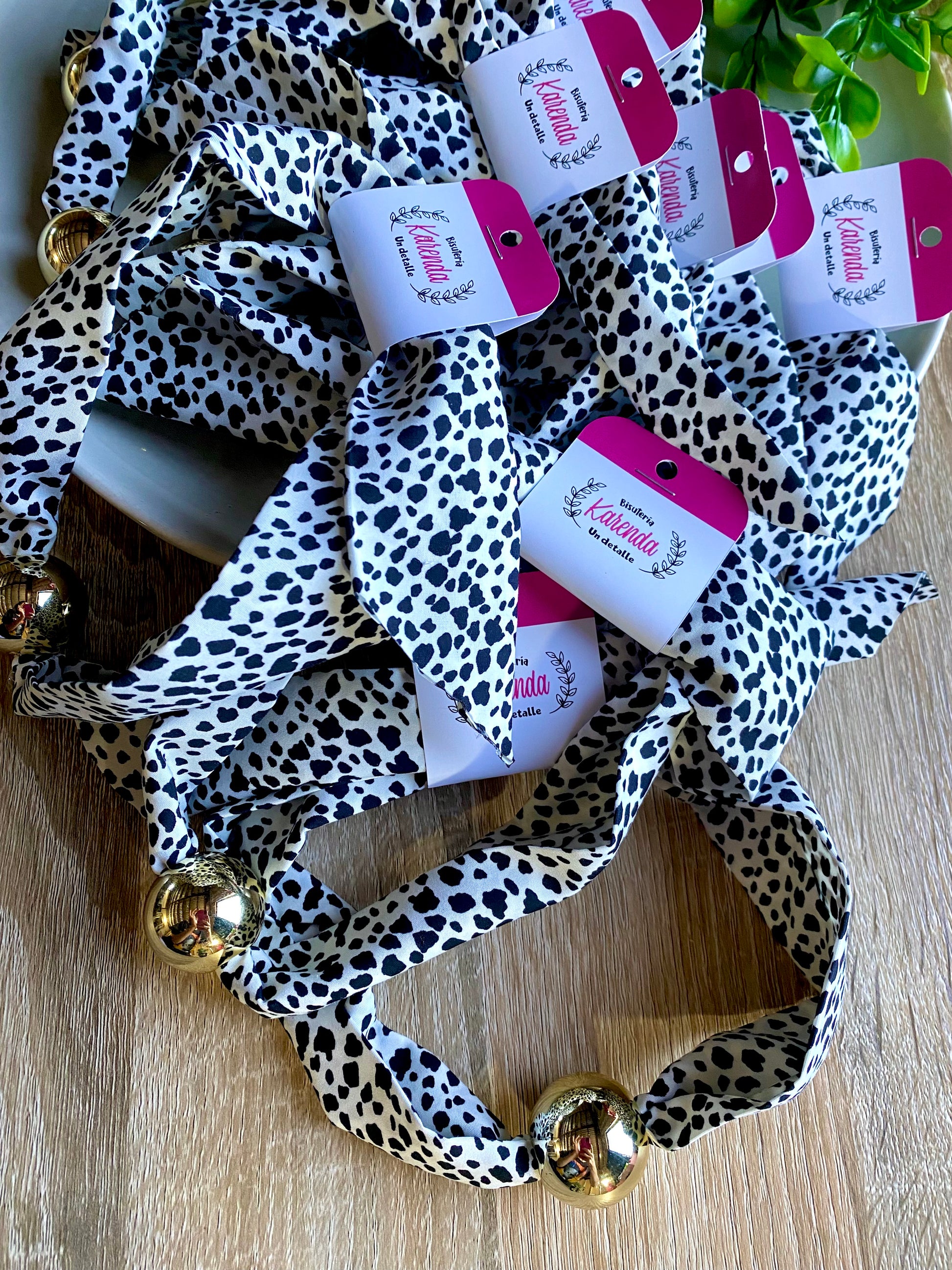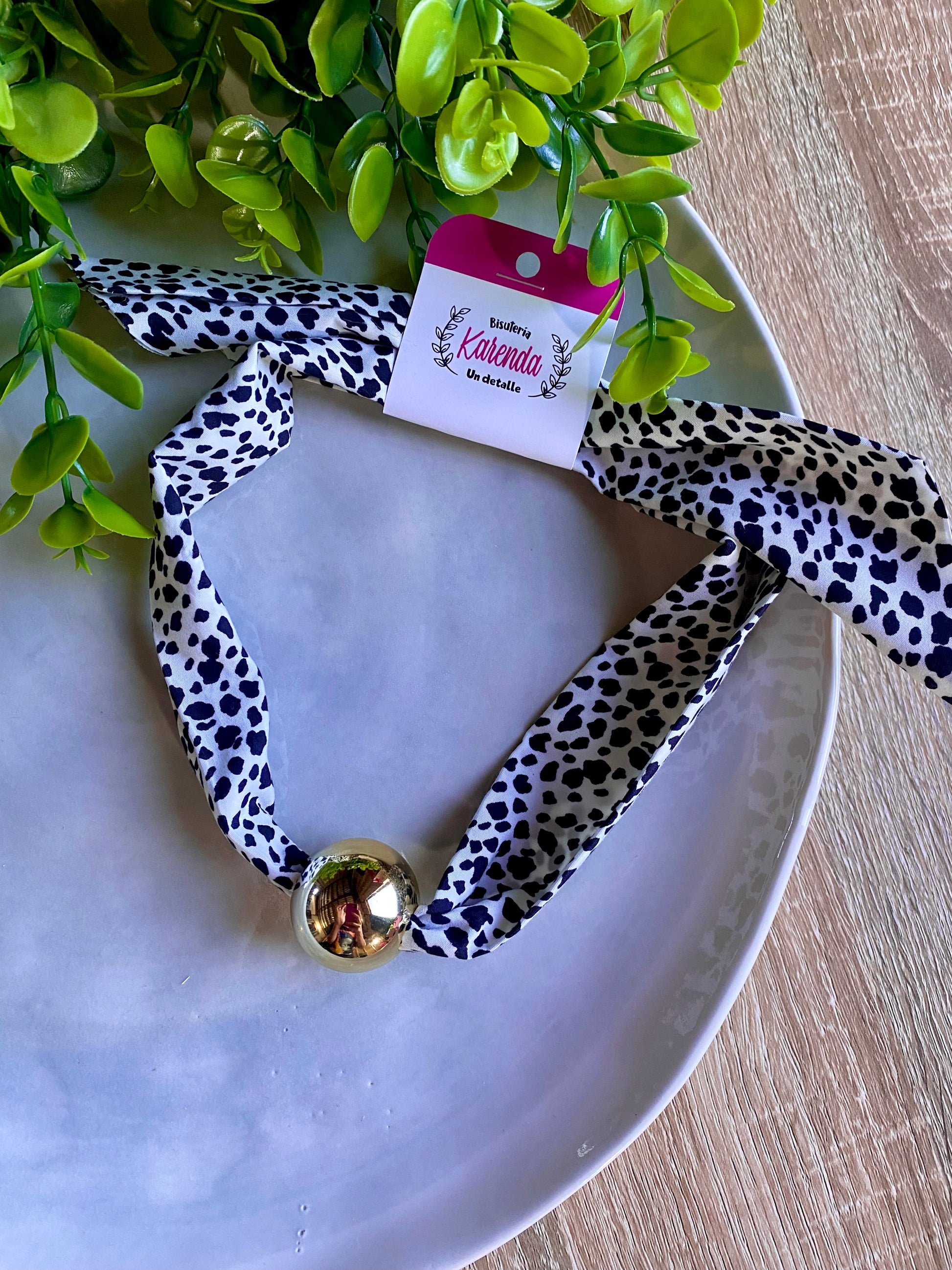 Collar elaborado de Tela con Manchitas Negras, con dije principal de Bola Extra Grande.