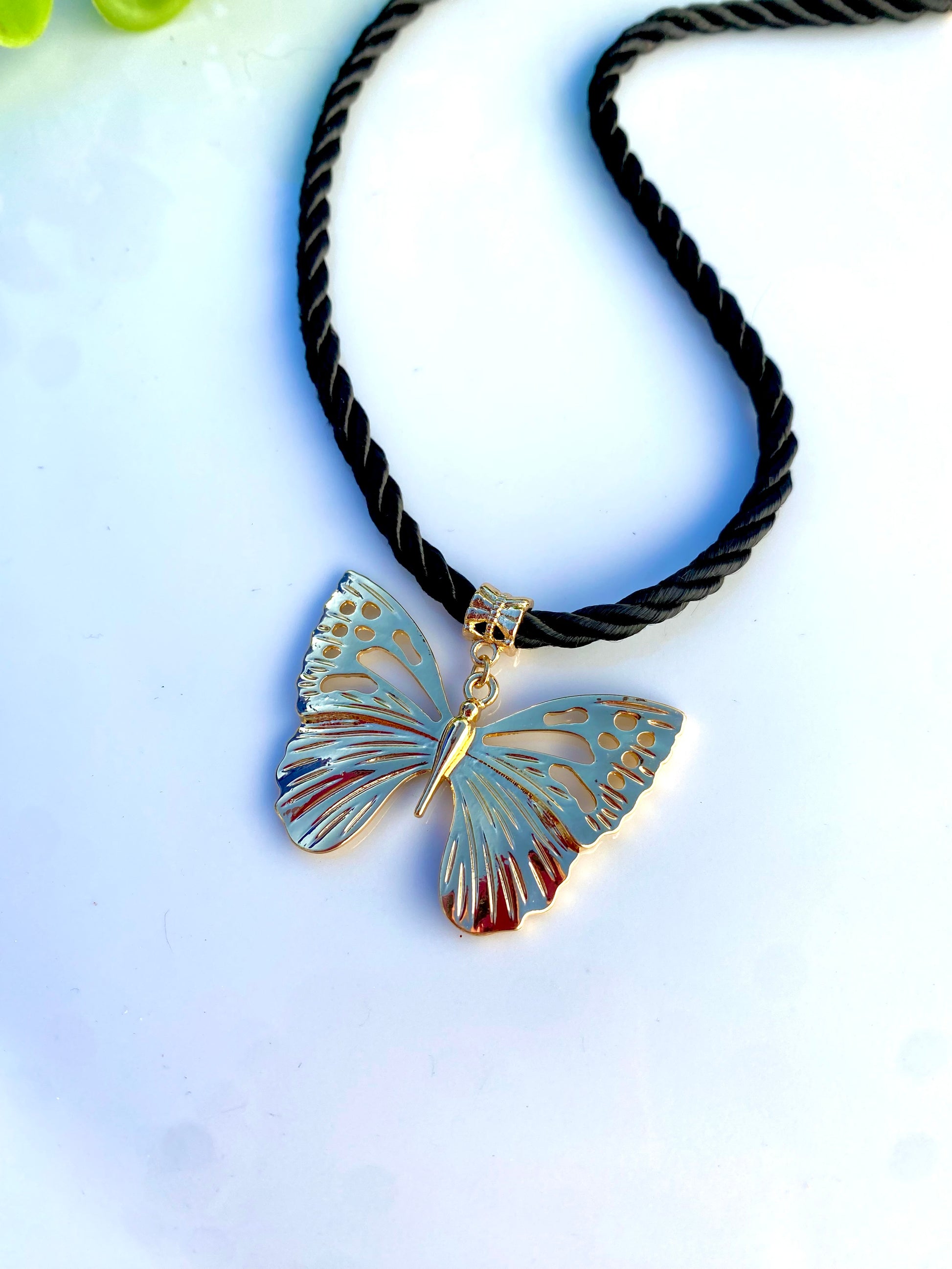 Collar elaborado con cuerda color Negro, con dije Maxi de Mariposa en color dorado.