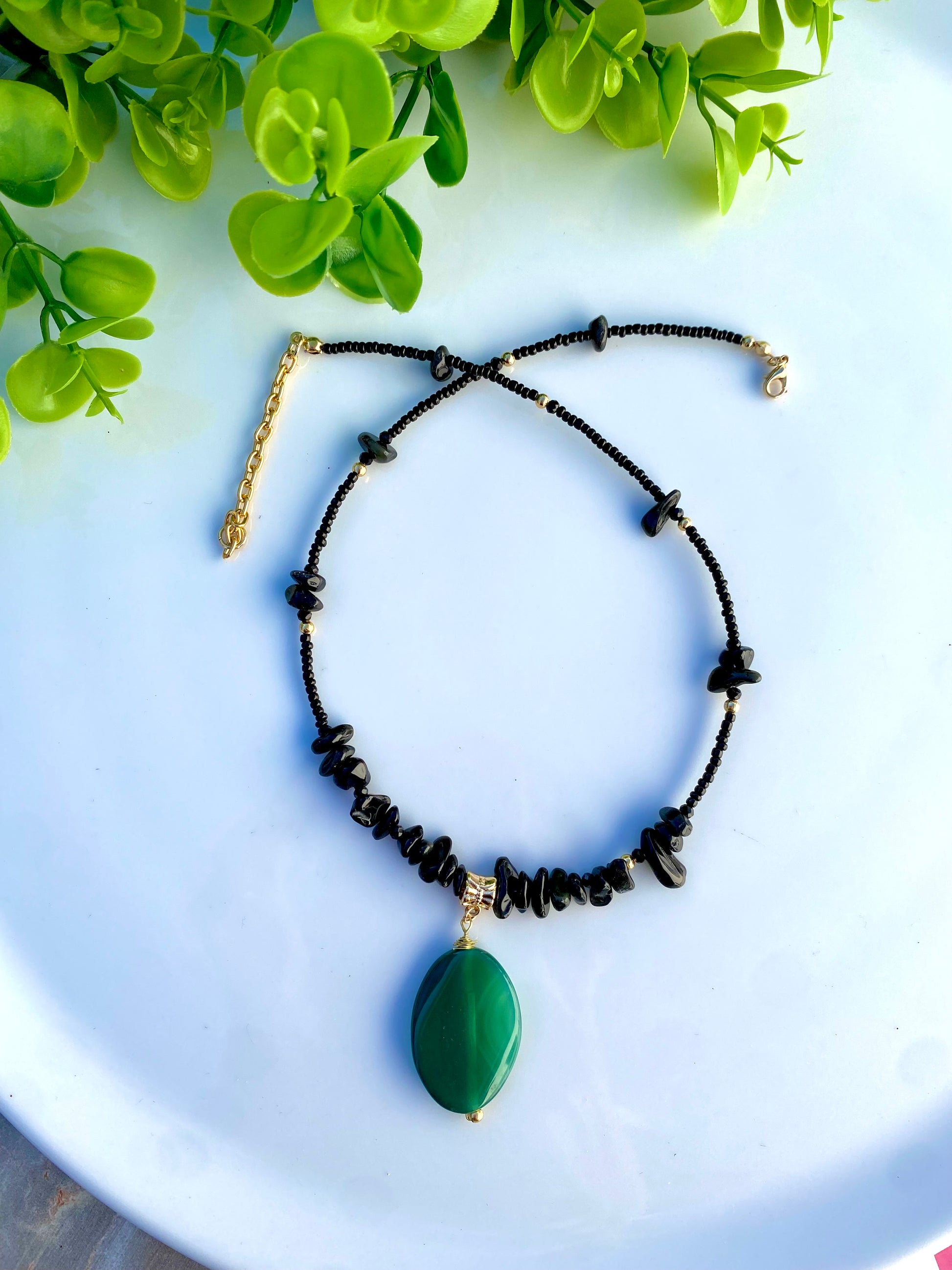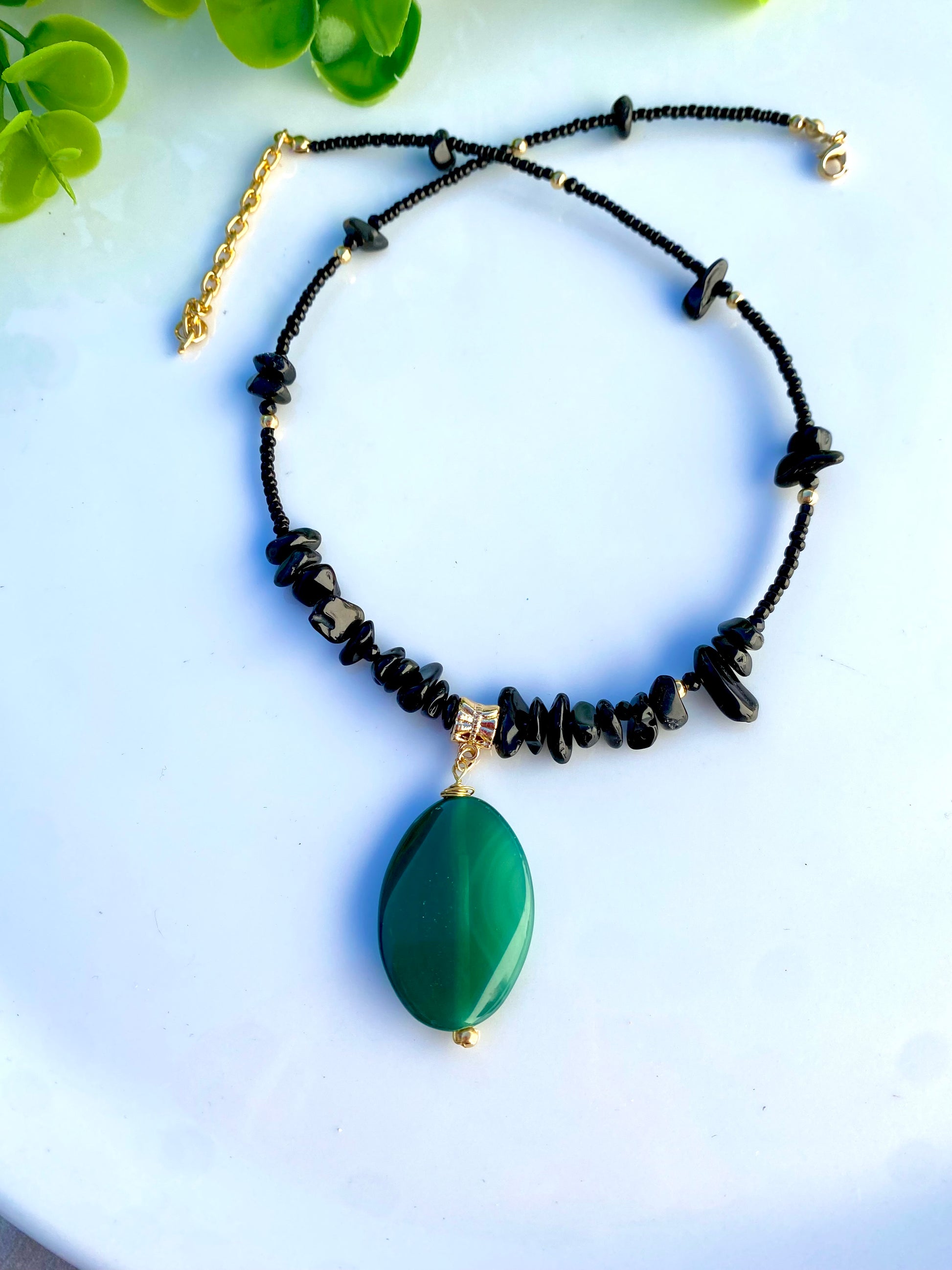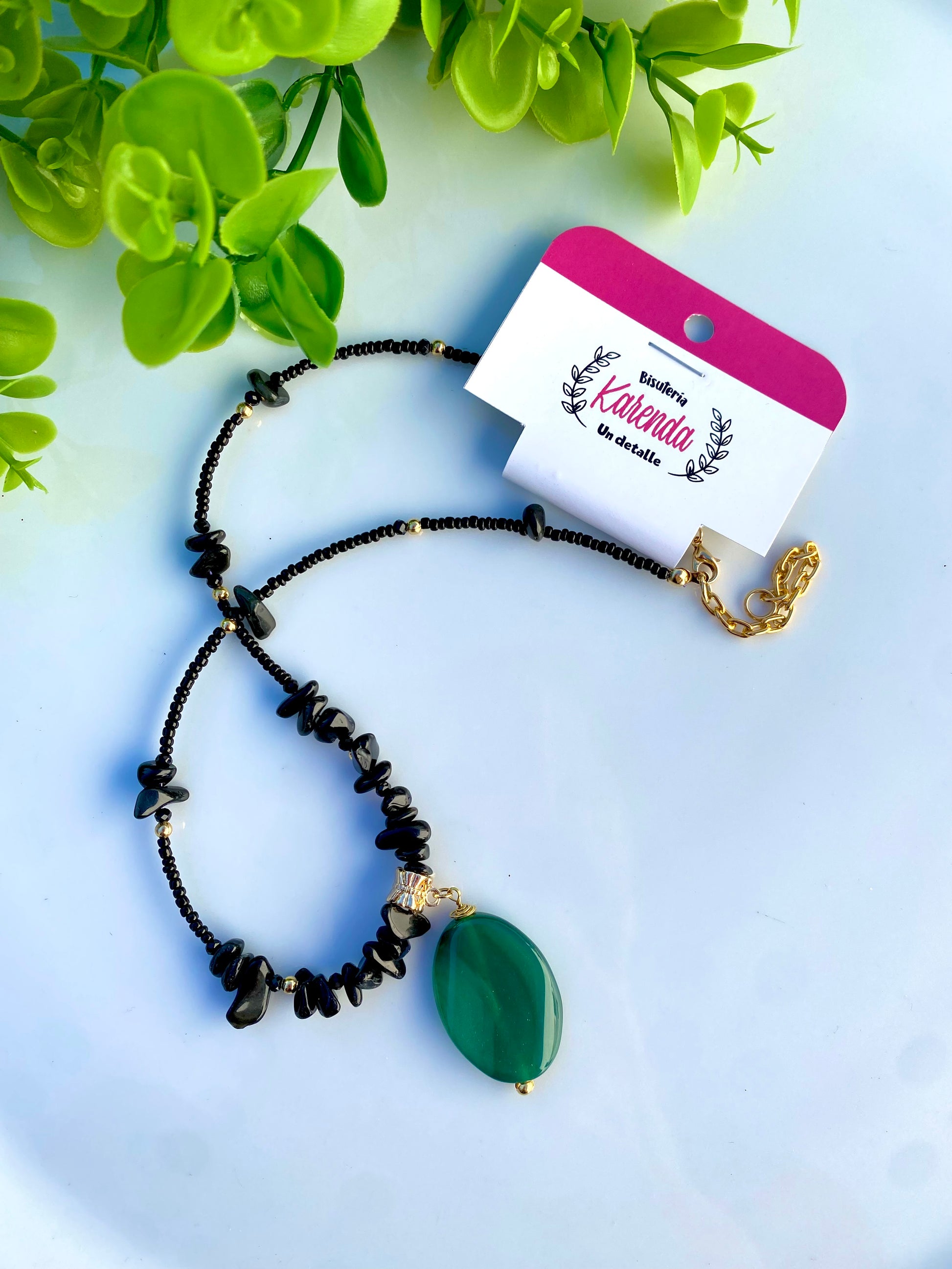 Collar elaborado con Chaquira, detalles de chip de piedra natural y dije colgante de Ágata.