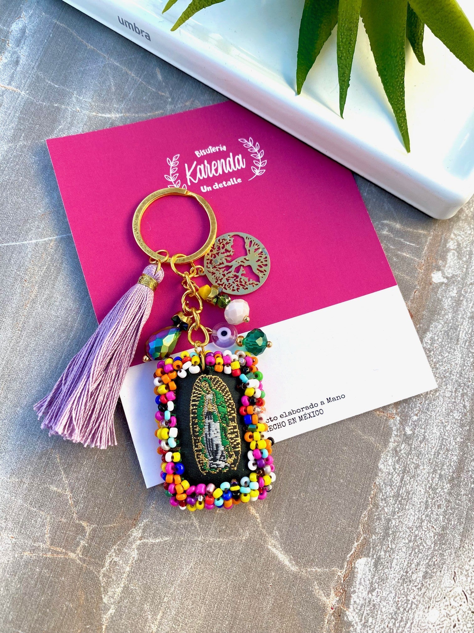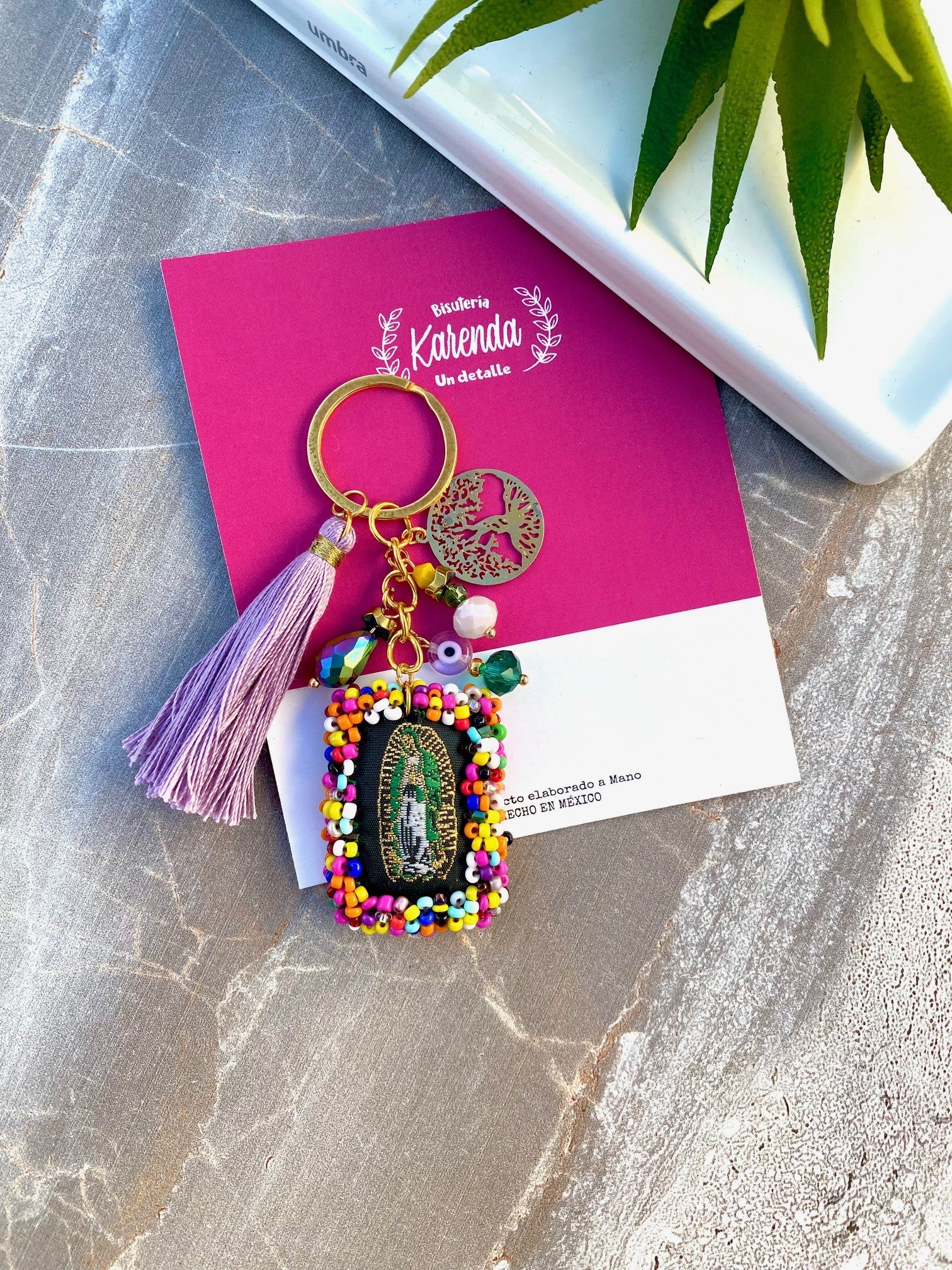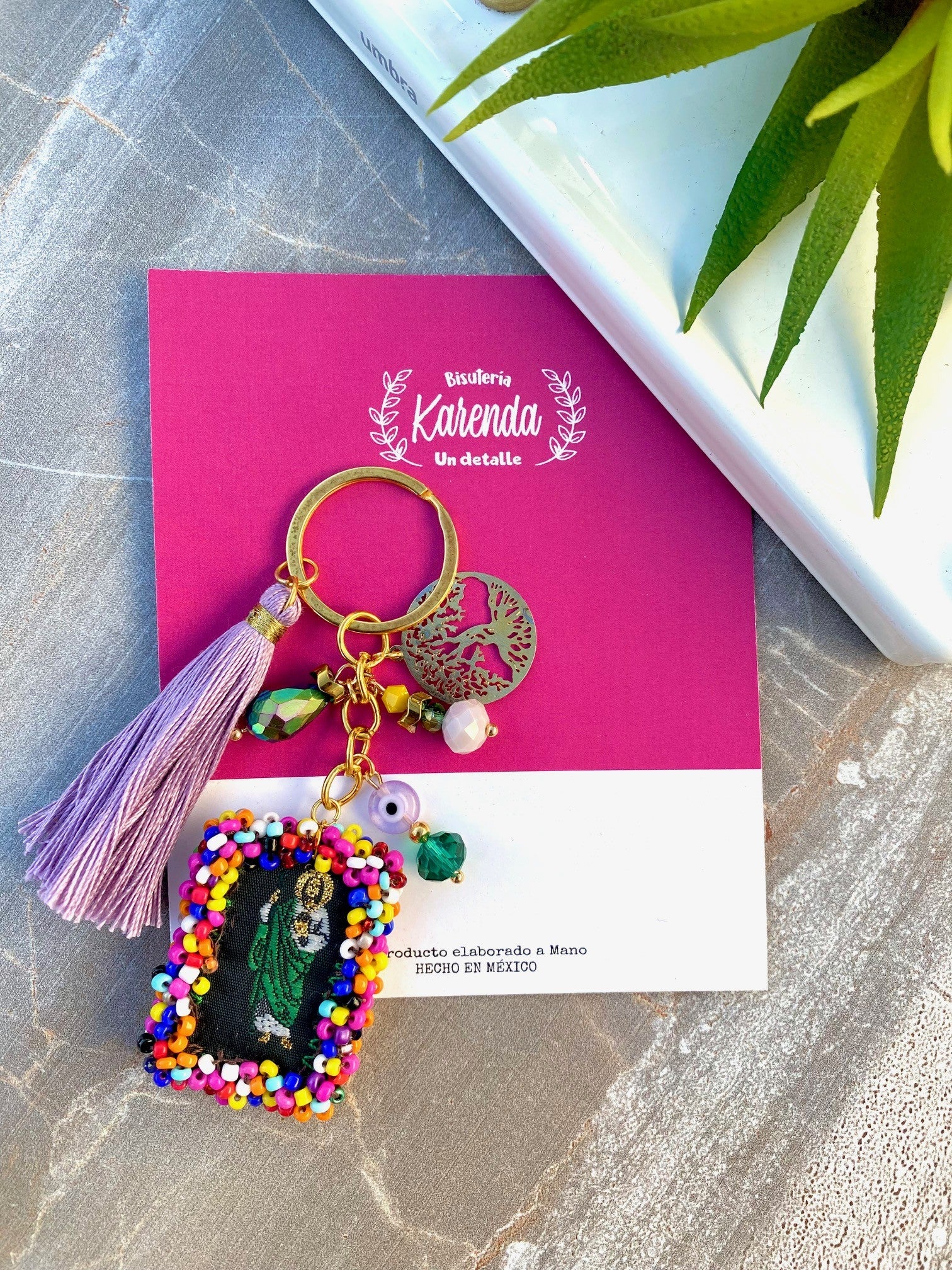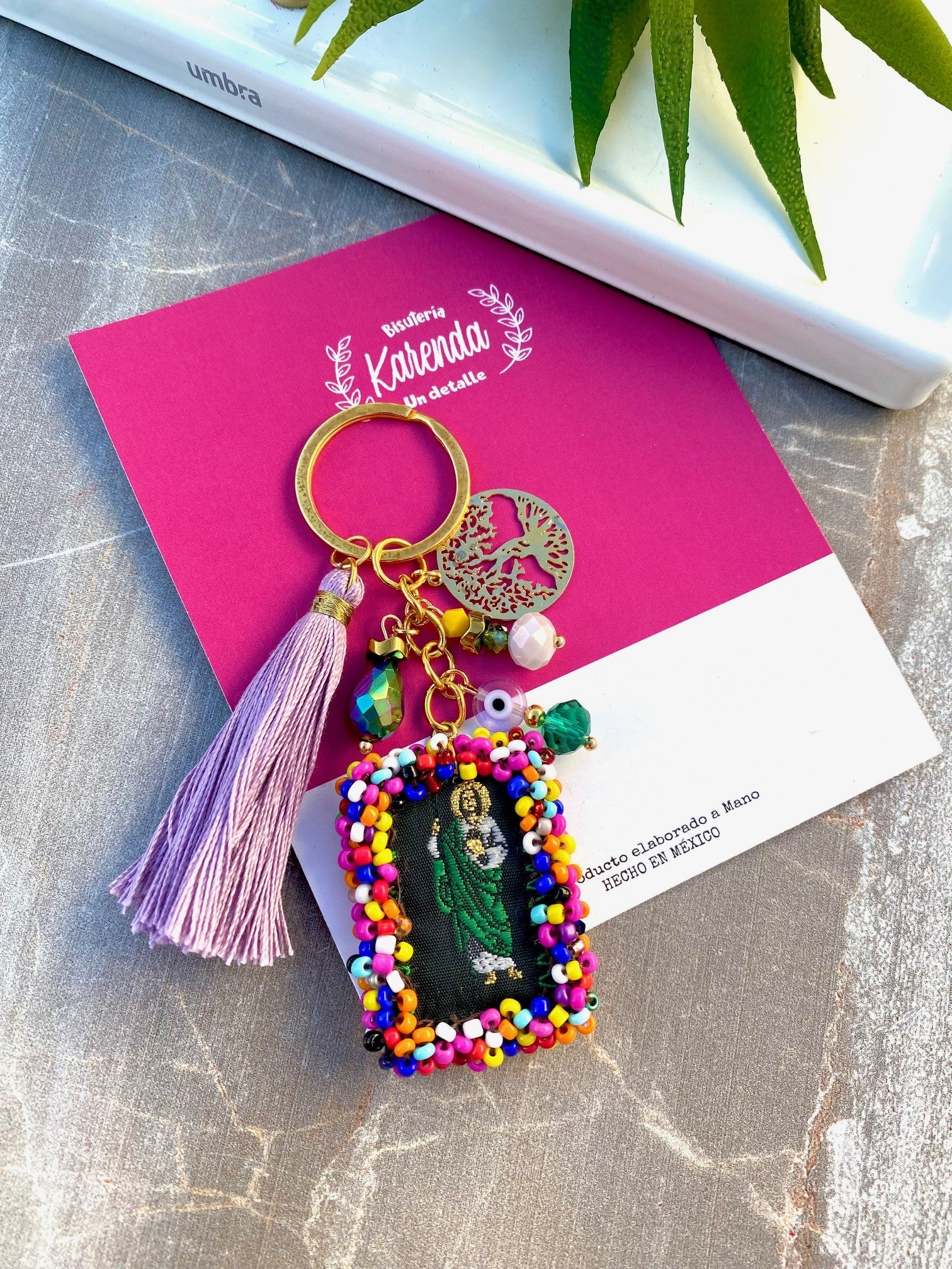 Llavero con imagen de San Judas Tadeo, bordado a Mano con chaquira de colores y detalles colgantes y Borla.