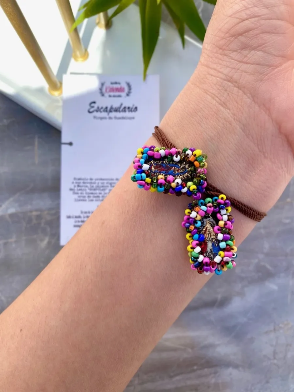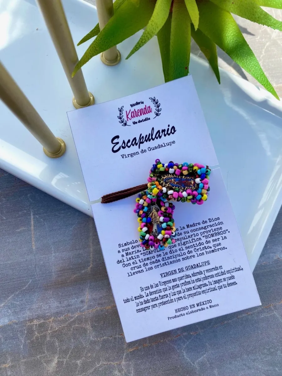 Escapulario Mini con la imagen de Divina Providencia y la Virgen de Guadalupe, Bordado a Mano con cuentas de Chaquira de colores.