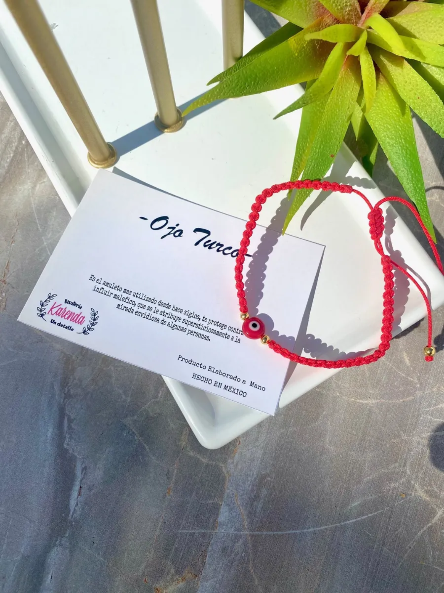 Pulsera de Hilo con Tejido Macramé y Dije de Ojo Turco Plano en color Rojo de Cristal.