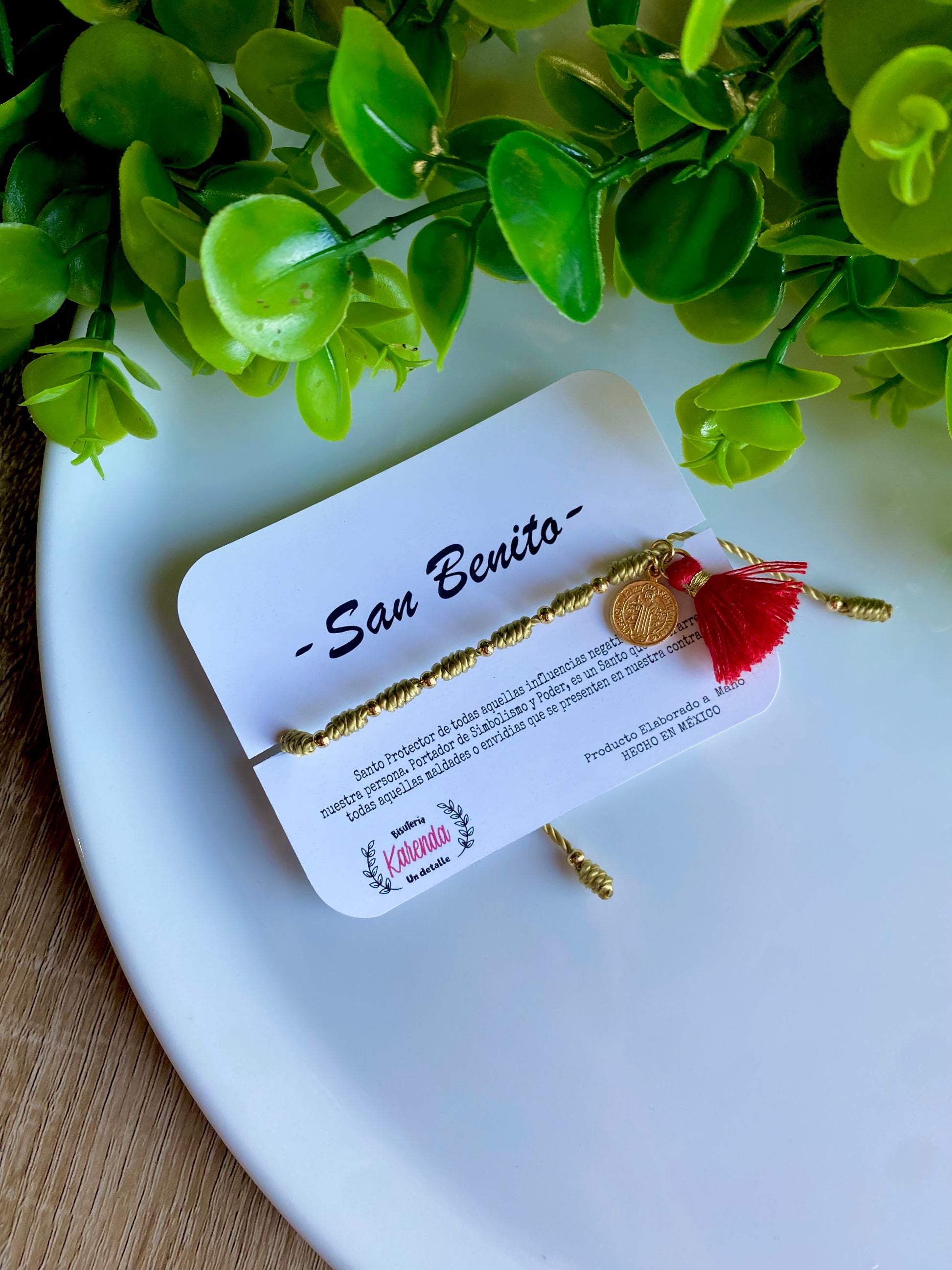 Pulsera Decenario elaborada con hilo, detalles dorados y Medalla de San Benito con Borla colgante.