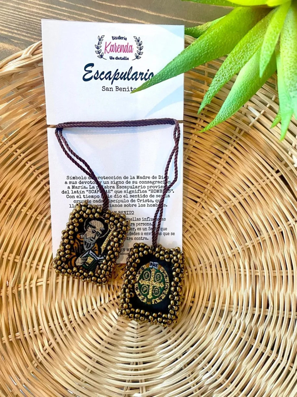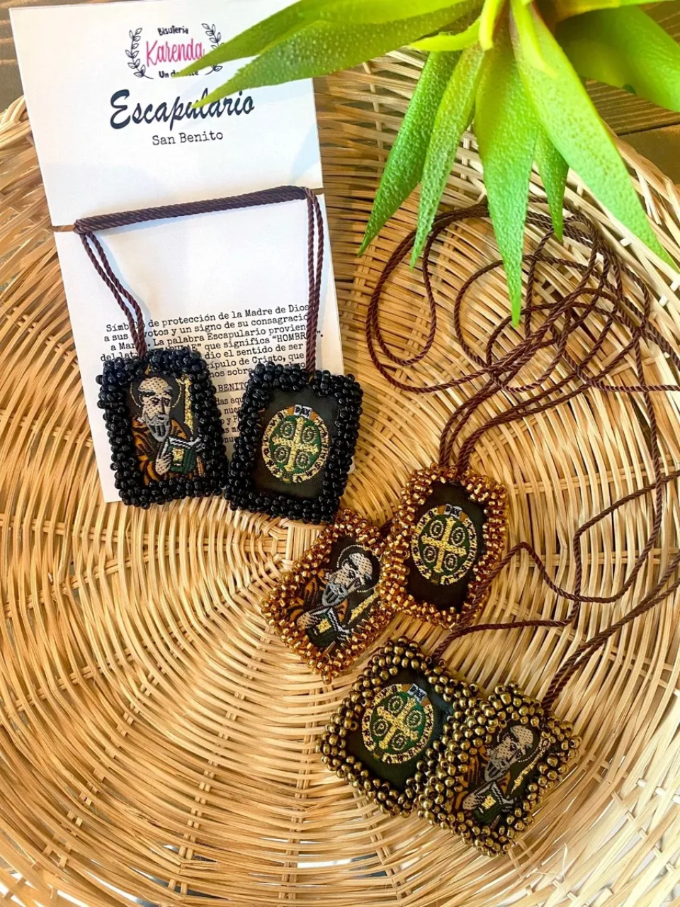 Escapulario Grande con la imagen de San Benito, Bordado a Mano con cuentas de Chaquira.
