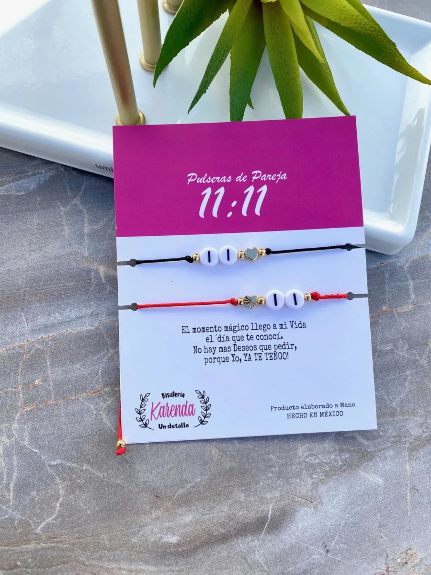 Set de Pulseras de Hilo elaborada con números acrílicos 11 y dije de Corazón en Chapa de Oro.