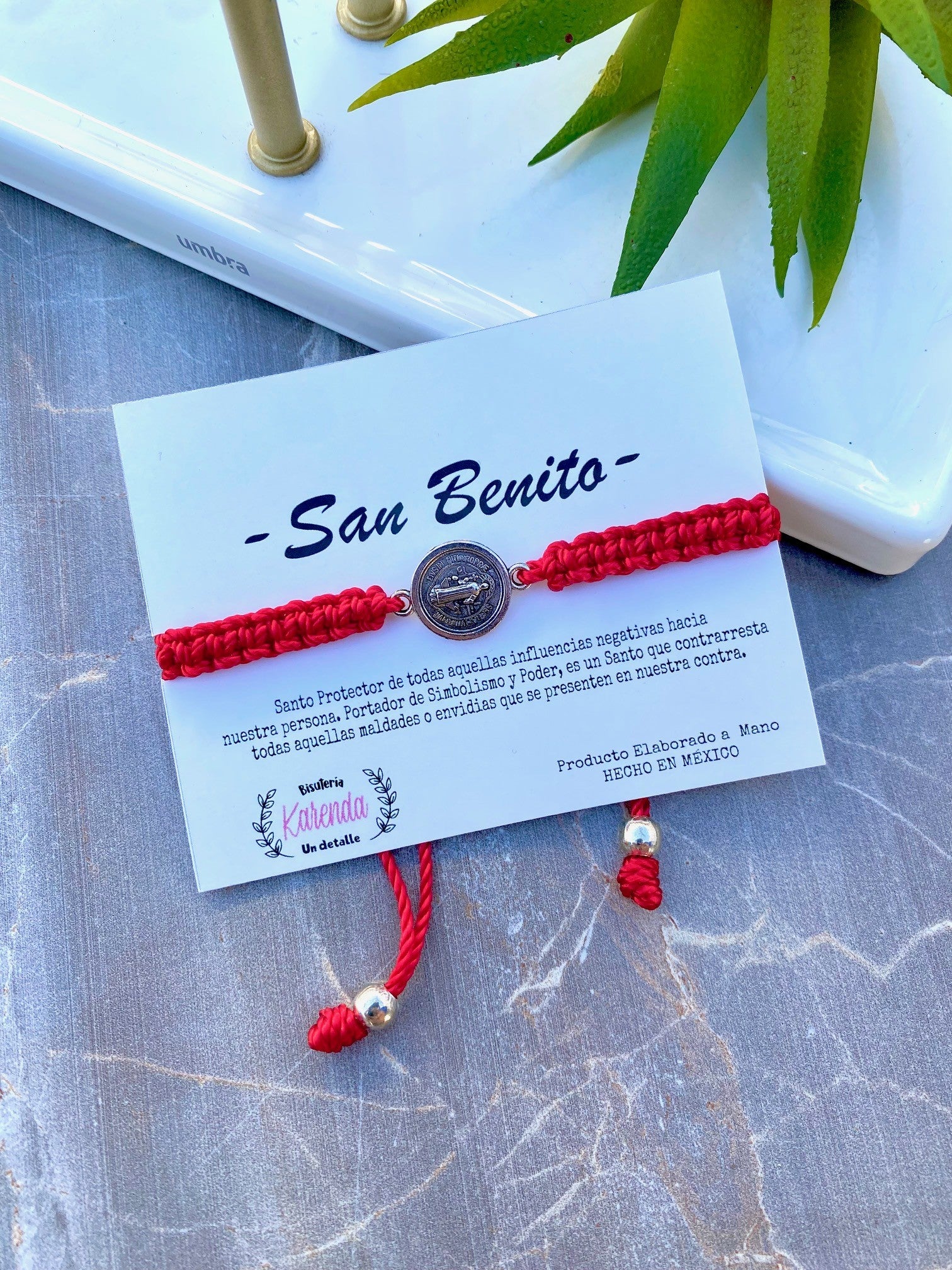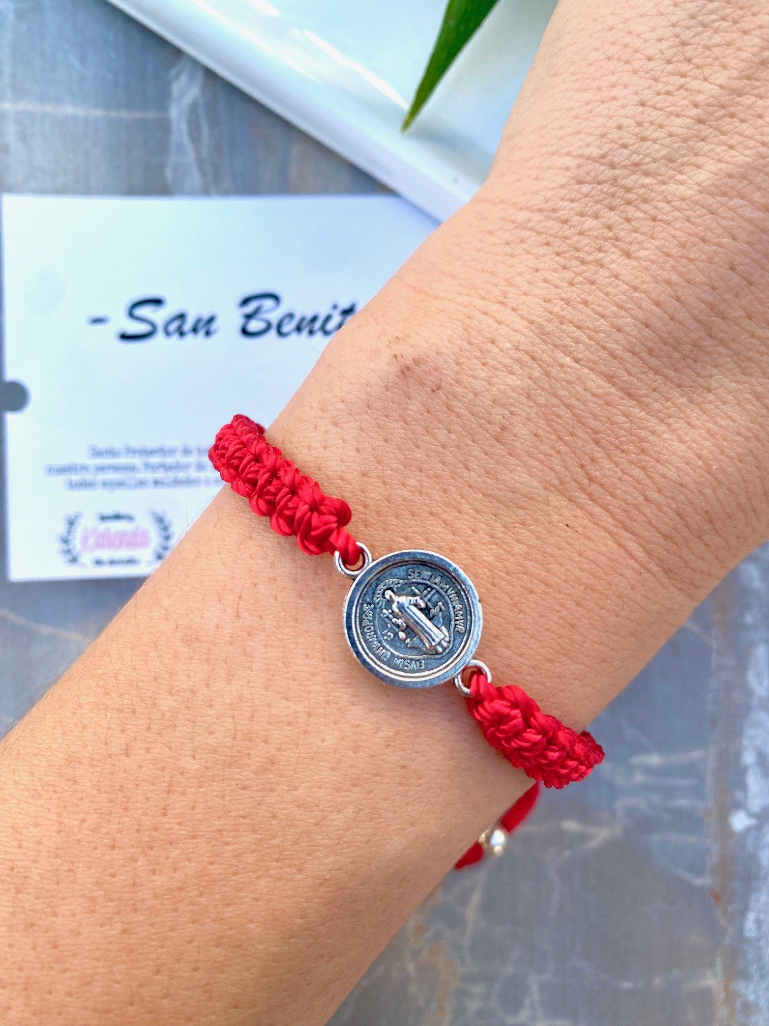 Pulsera de Hilo elaborada con tejido macramé y medalla plateada de San Benito.