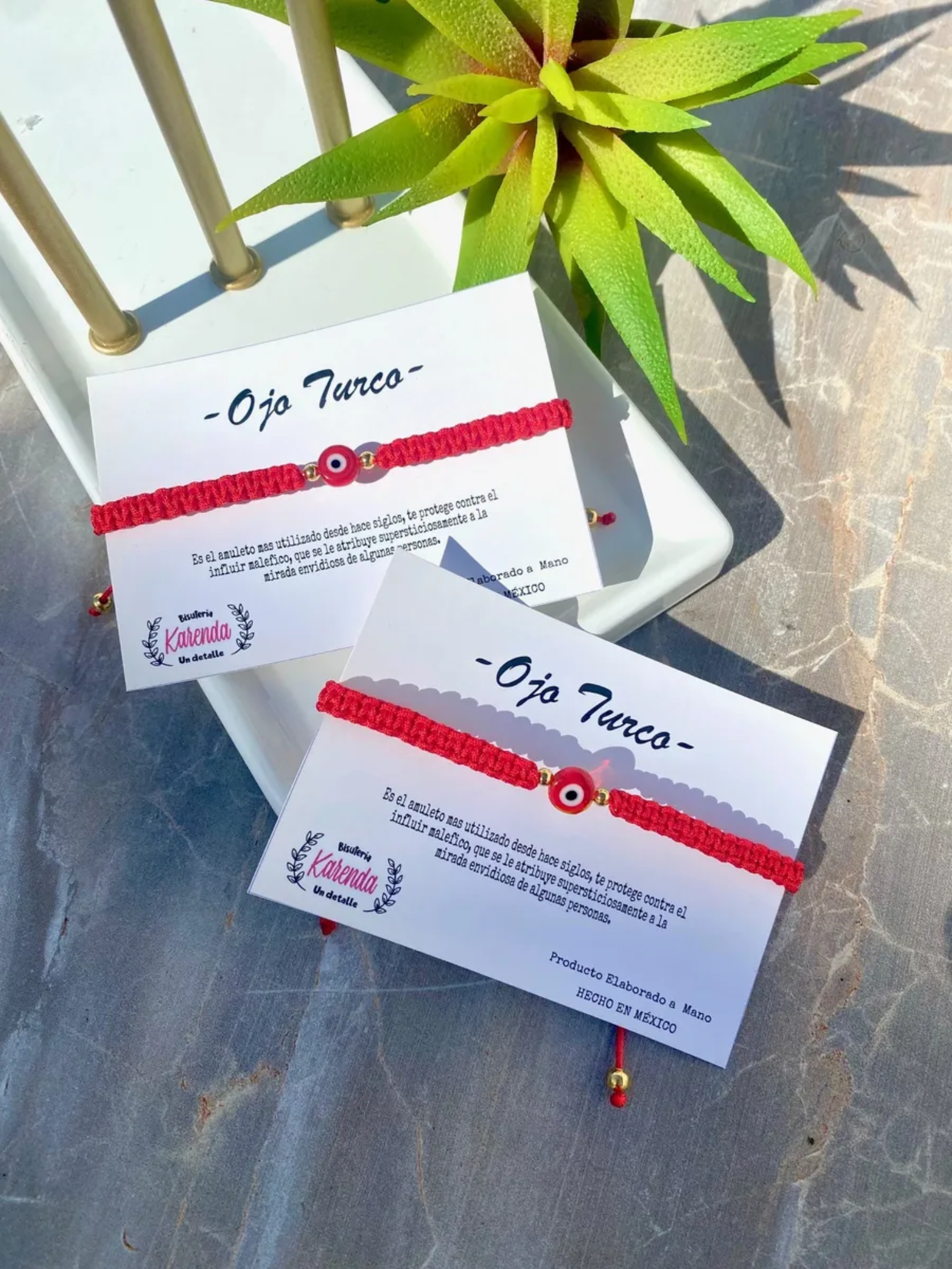 Set de 2 Pulsera de Hilo con Tejido Macramé y Dije de Ojo Turco Plano en color Rojo de Cristal.