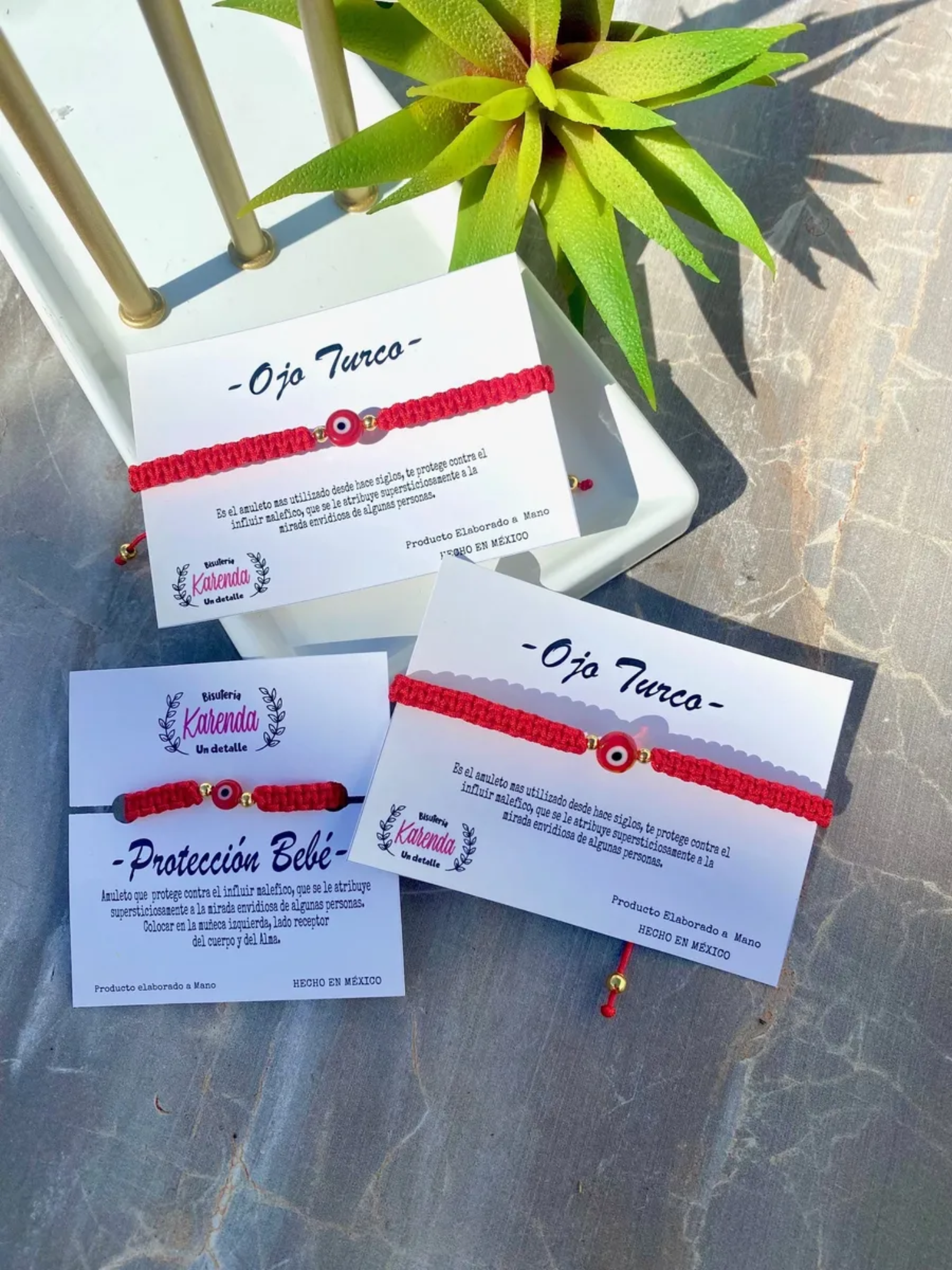 Set de 3 Pulsera de Hilo con Tejido Macramé y Dije de Ojo Turco Plano en color Rojo de Cristal.