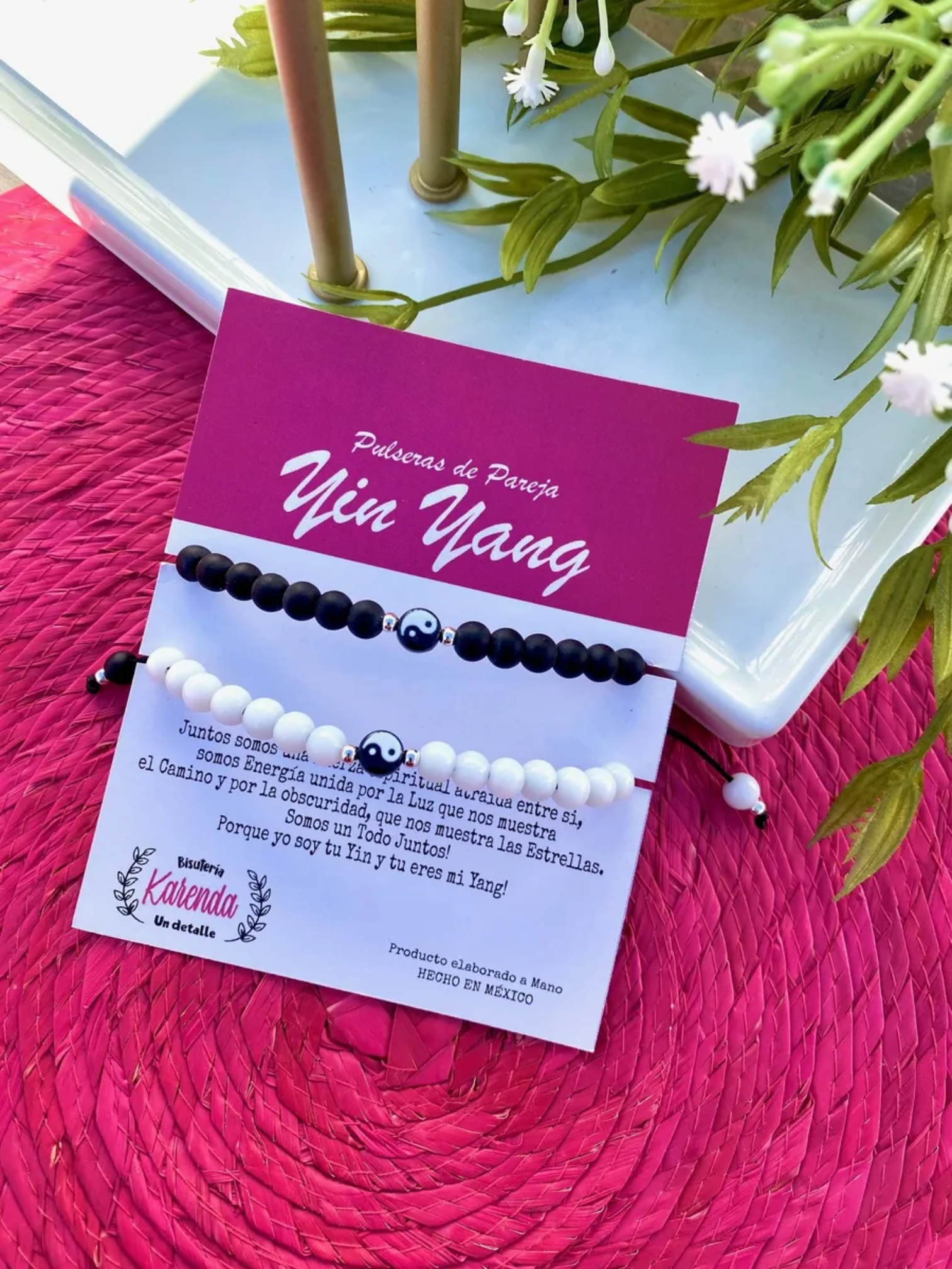 Set de 2 Pulseras de Pareja elaboradas con hilo y cuentas negras y blancas, con dije principal de Yin Yang.