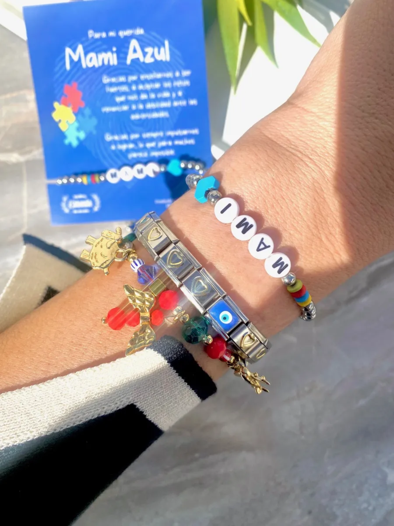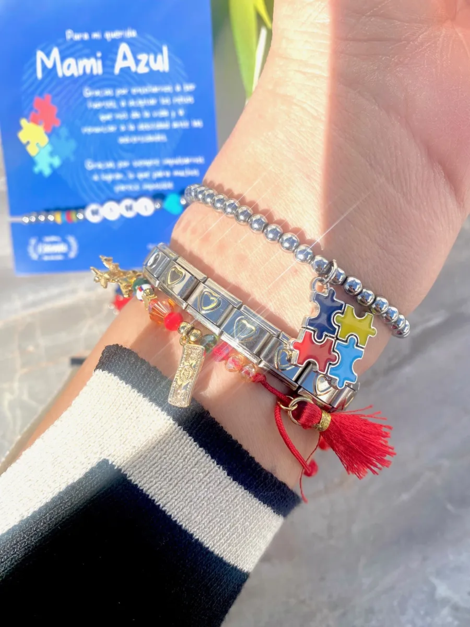 Pulsera de elástico, elaboradas con cuentas de Hematita Plateada y de colores, detalle de corazón y con Dije Colgante de Rompecabezas.