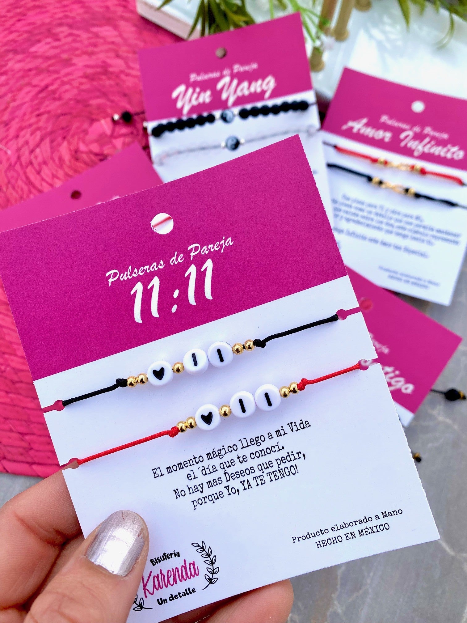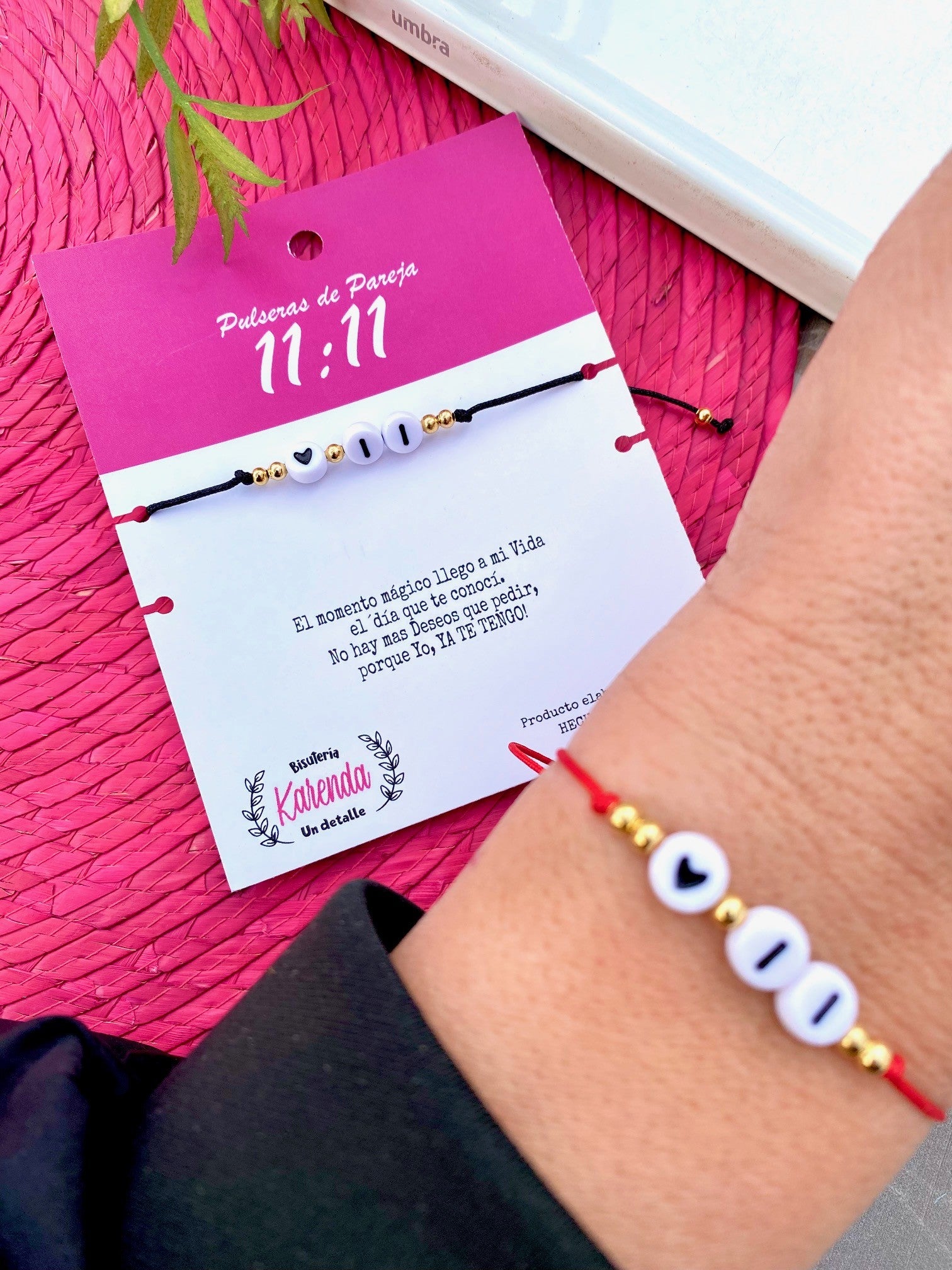 Set de 2 Pulseras de Pareja 11 11, elaboradas con hilo, con números acrílicos y corazón, detalles dorados de Chapa.