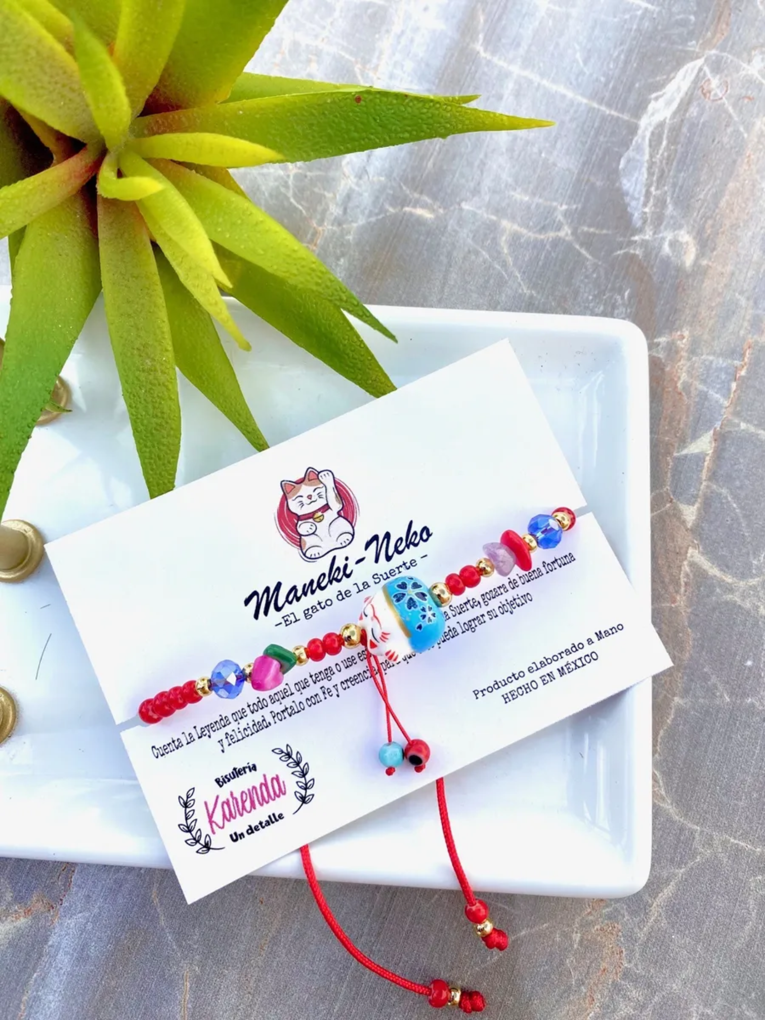 Pulsera de Hilo elaborada con cuentas de chaquiron calibrado, con dije principal de Maneki Neko y detalles de Chip de Piedra Natural y cordones de Ojito Turco Mini.