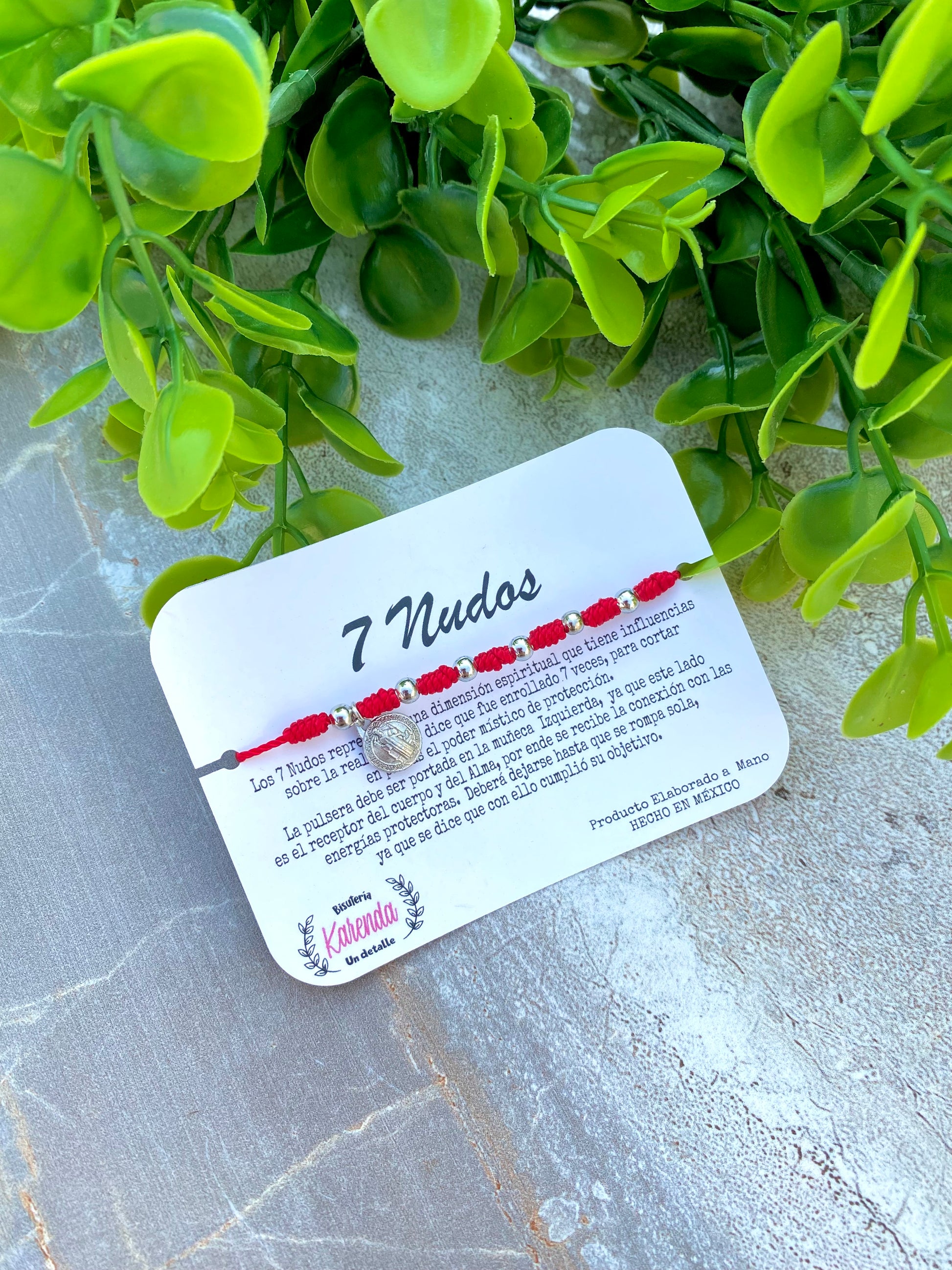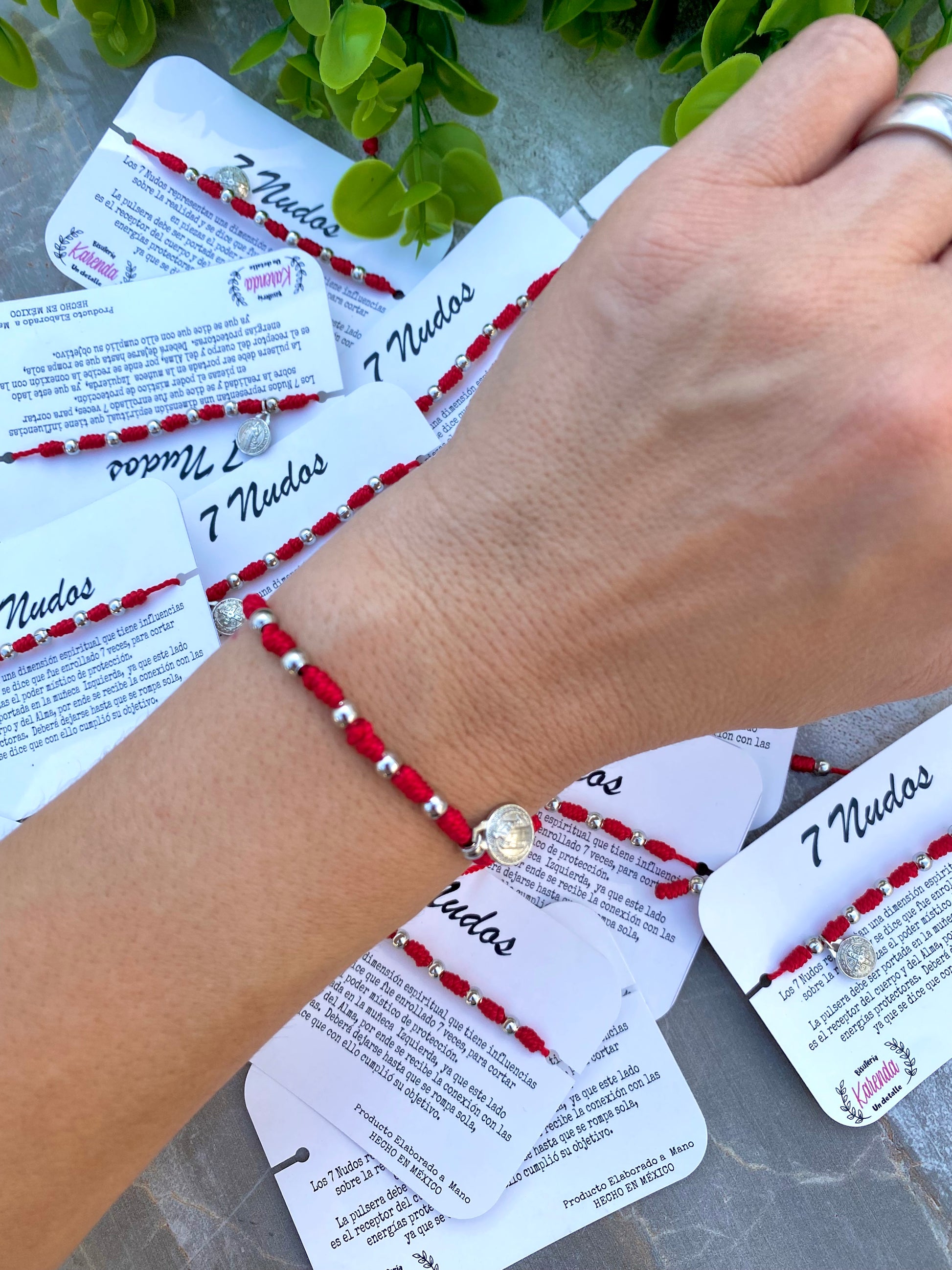 Pulsera de Hilo elaborada con 7 nudos y detalles plateados con medalla de San Benito.