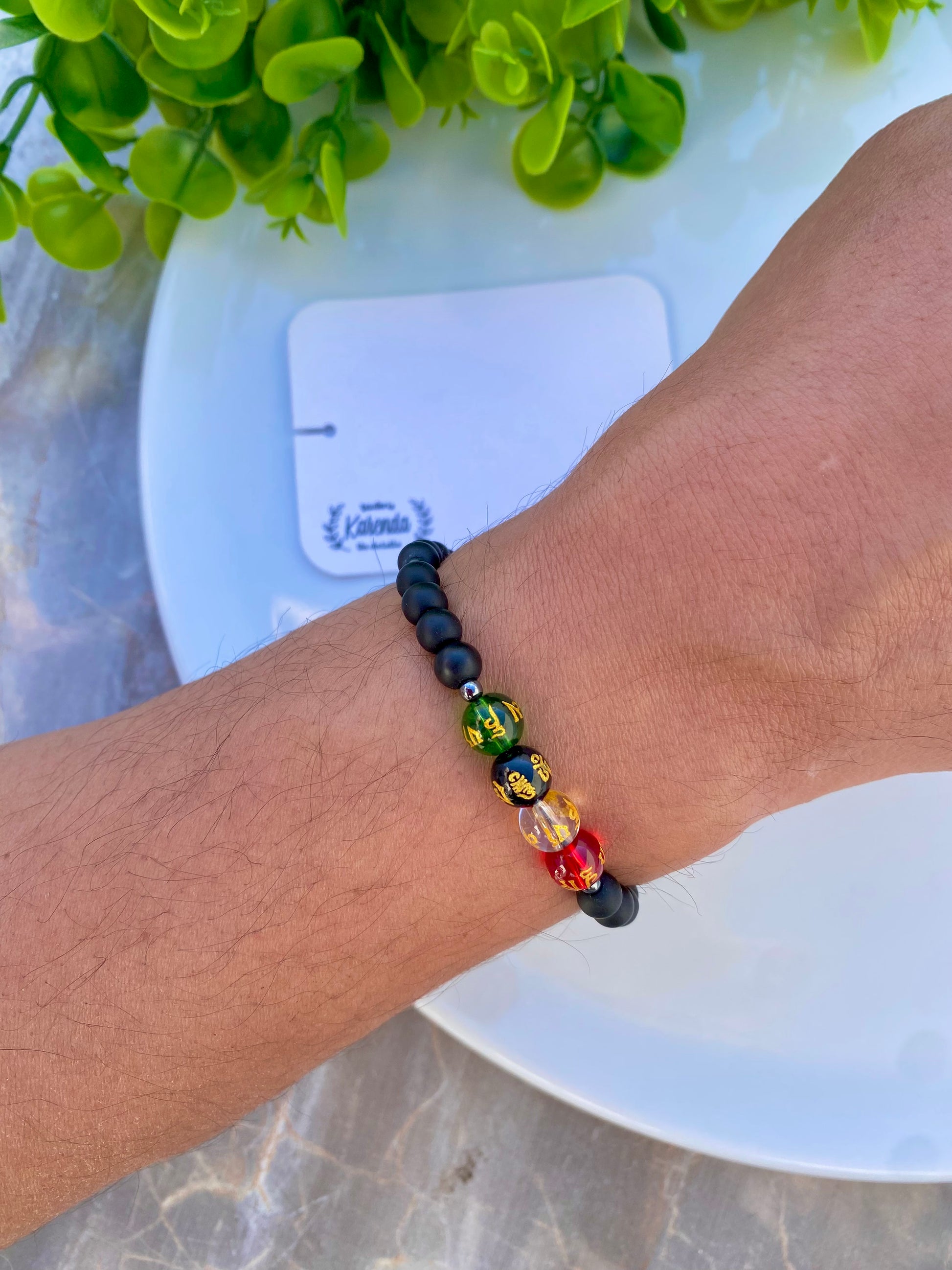 Material: Hematita Humo/ Textil / Ónix color Negro Mate de 6mm/ cuentas de Plasti Cristal con detalles de Letras Chinas.