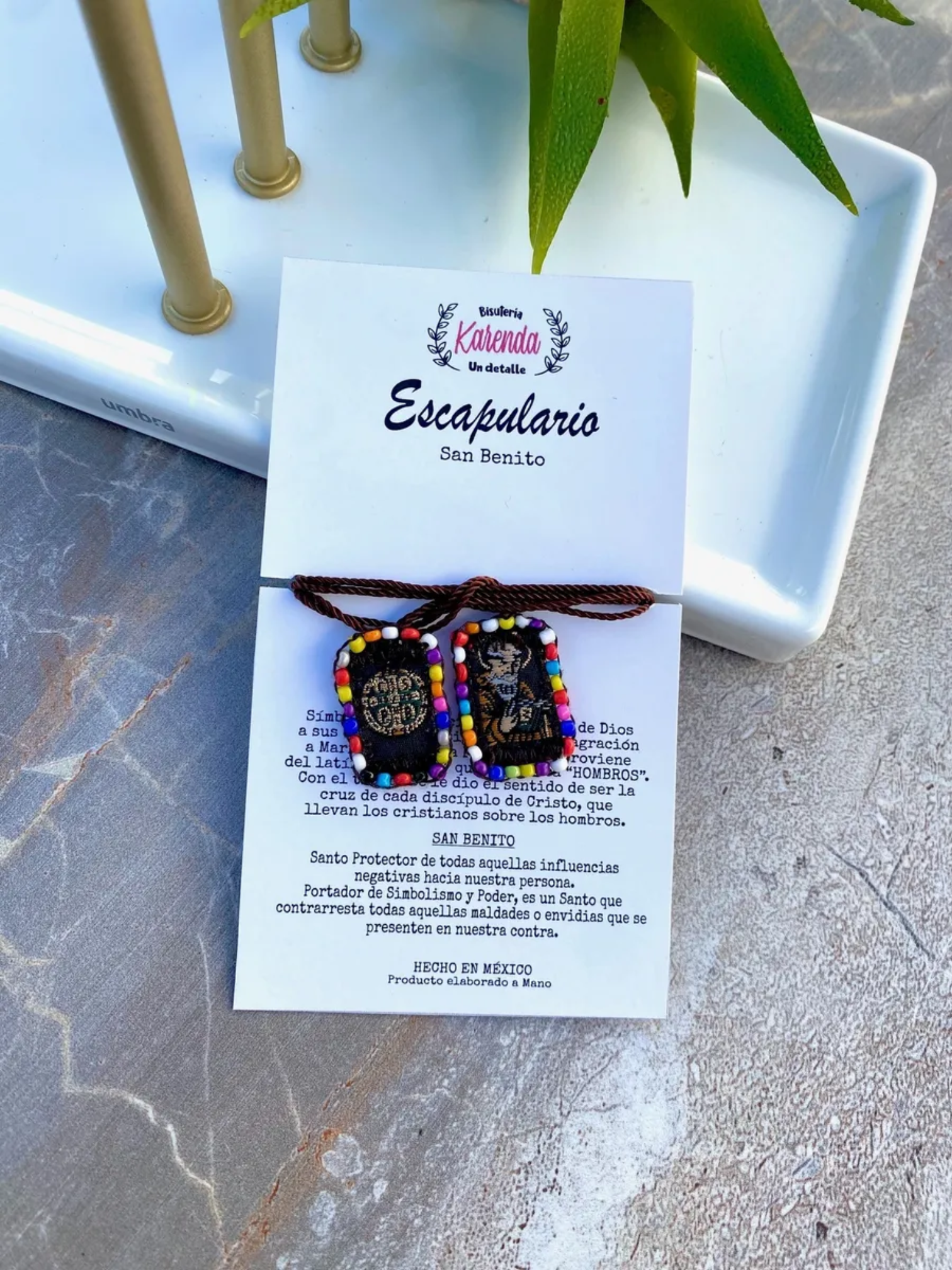 Escapulario Mini con la imagen de San Benito Bordado a Mano con técnica sencilla y cuentas de Chaquira de Colores.