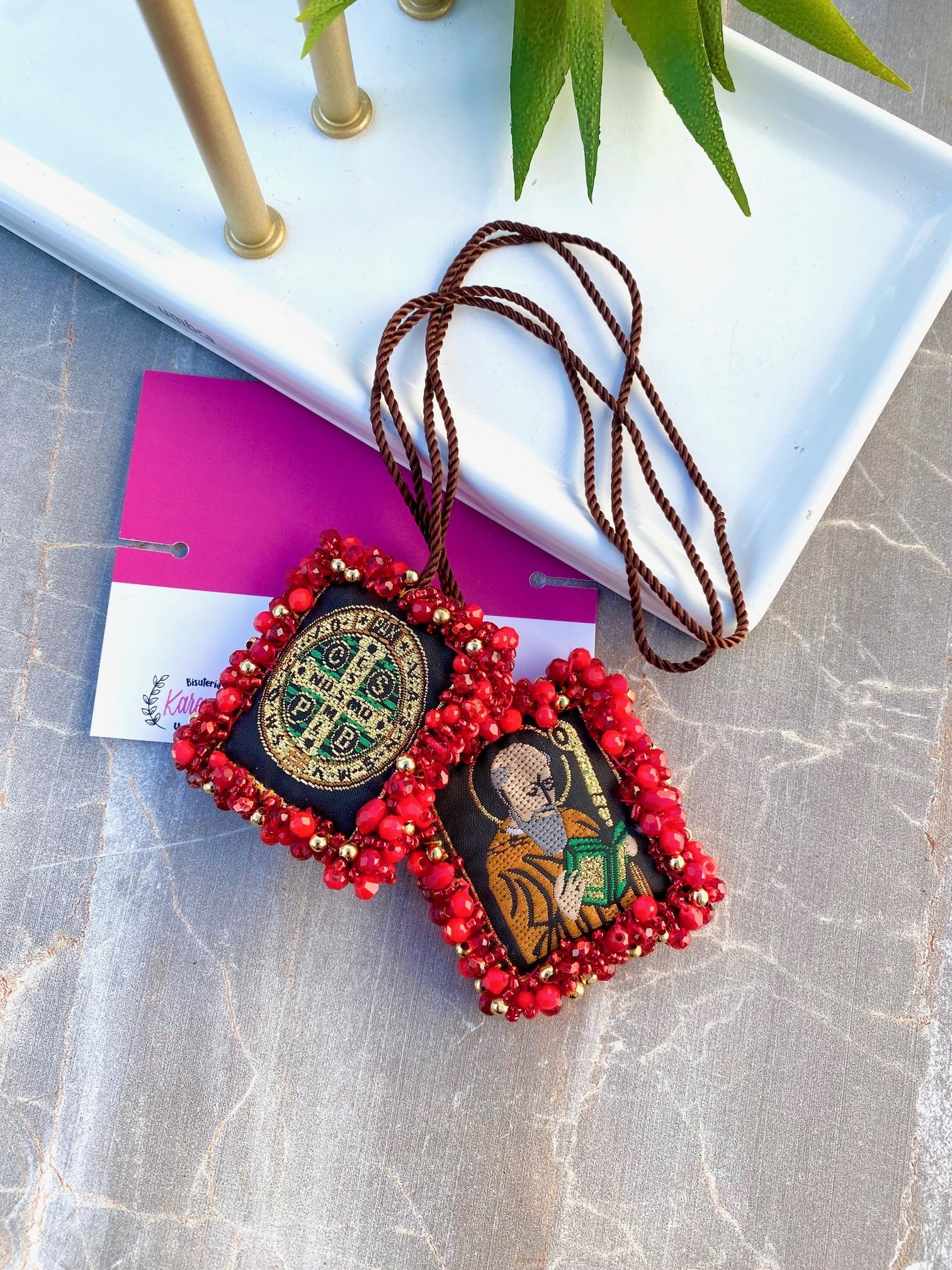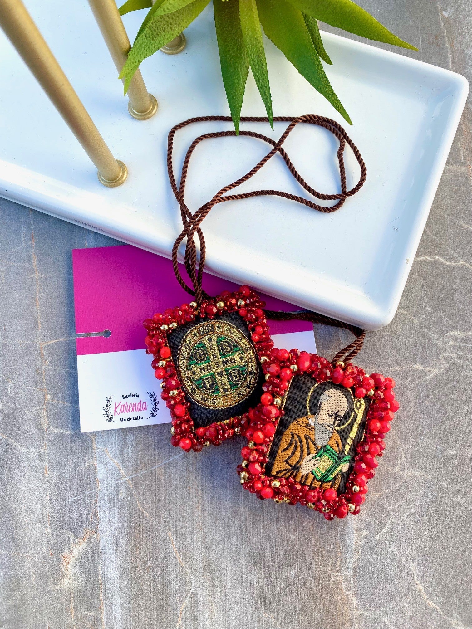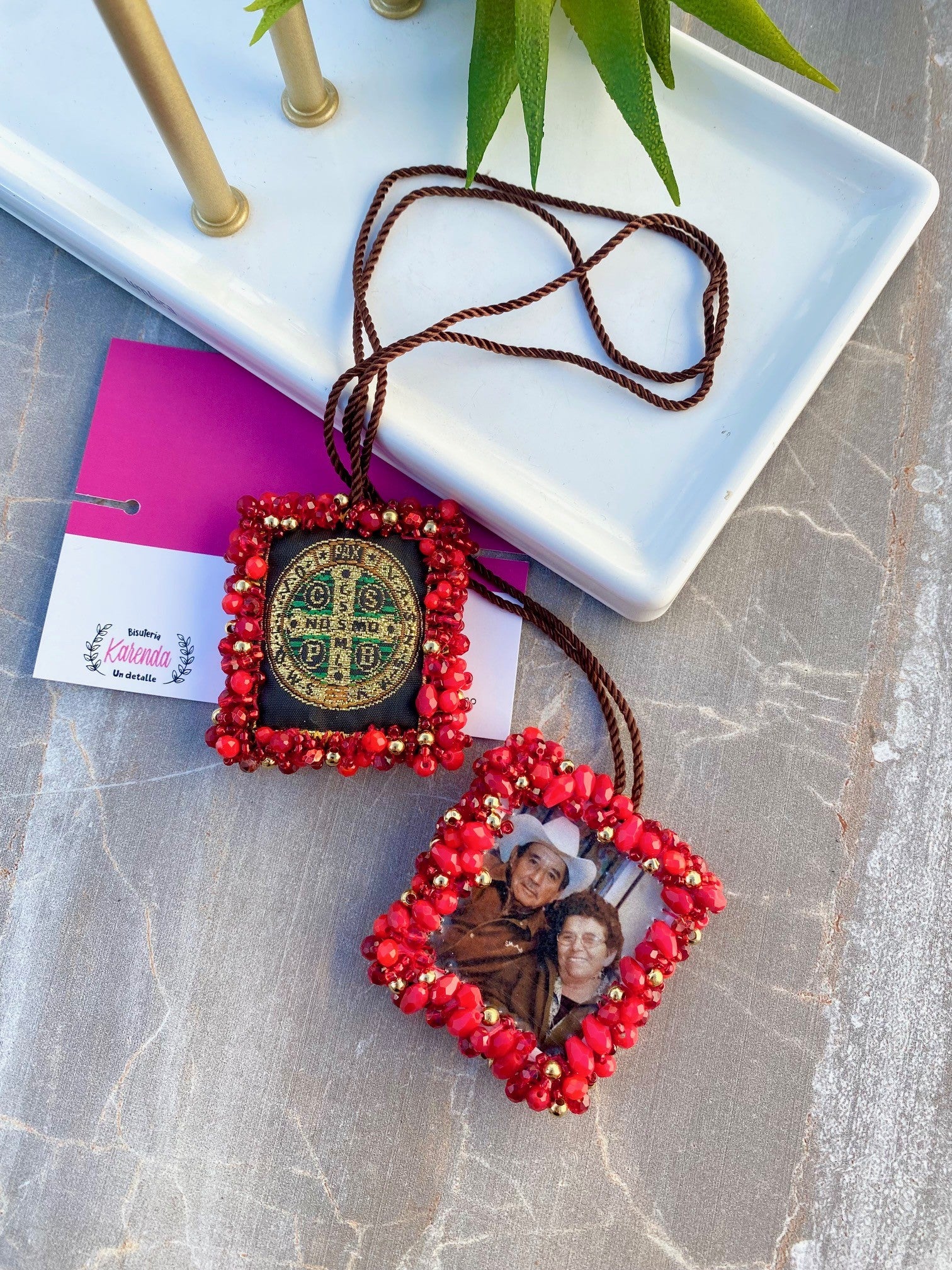 Escapulario Extra Grande para colocar en Carro, bordado con Cristal y detalles dorados, esta personalizado con 2 Fotografías ( o puede ser la misma) y al reverso el símbolo e imagen de San Benito.
