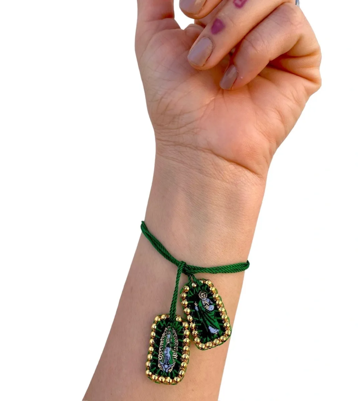 Escapulario Mini con la imagen de San Judas Tadeo & Virgen de Guadalupe, Bordado a Mano con técnica sencilla y cuentas de Chapa de Oro de 3mm.