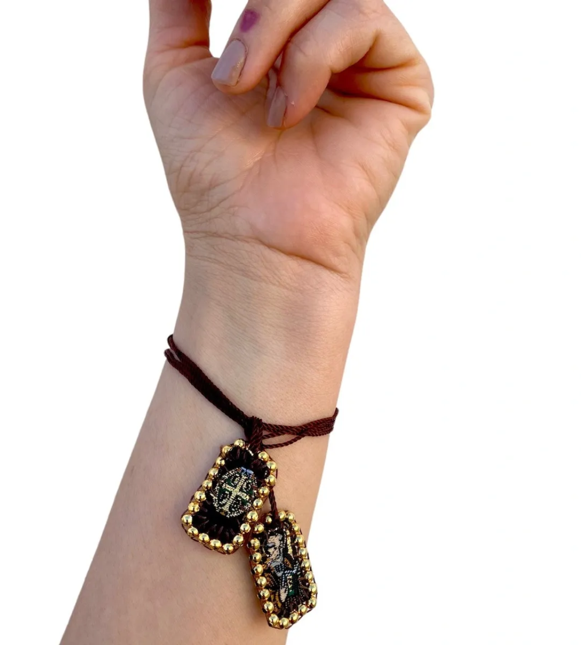 Escapulario Mini con la imagen de San Benito, Bordado a Mano con técnica sencilla y cuentas de Chapa de Oro de 3mm.
