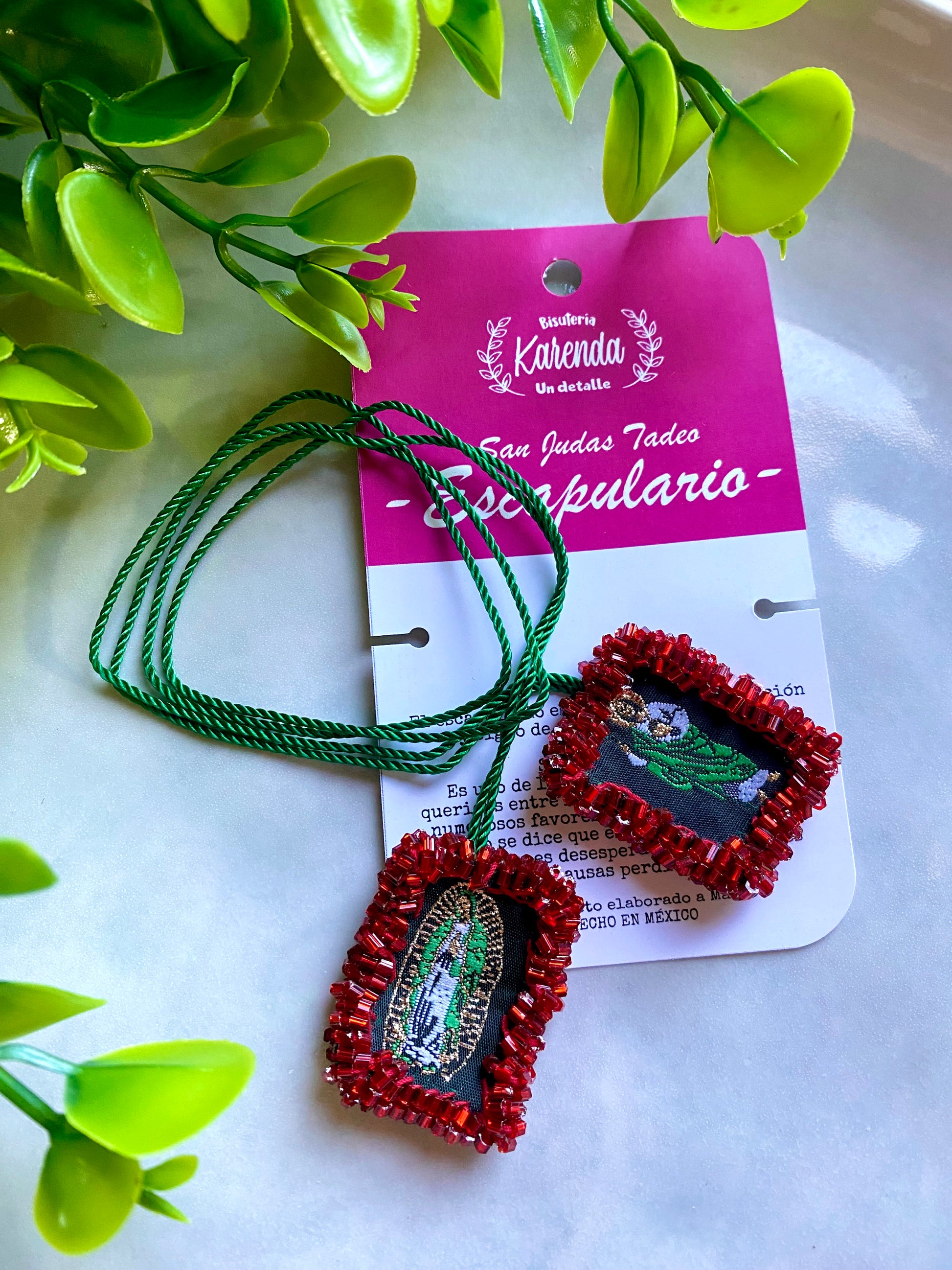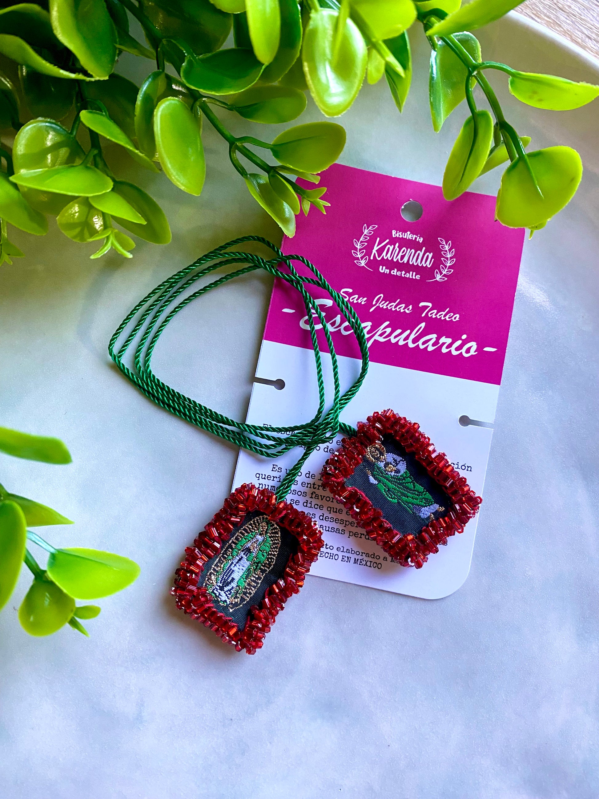 Escapulario Grande con la imagen de San Judas Tadeo y la Virgen de Guadalupe (doble vista), Bordado a Mano con cuentas de Canutillo color Rojo.